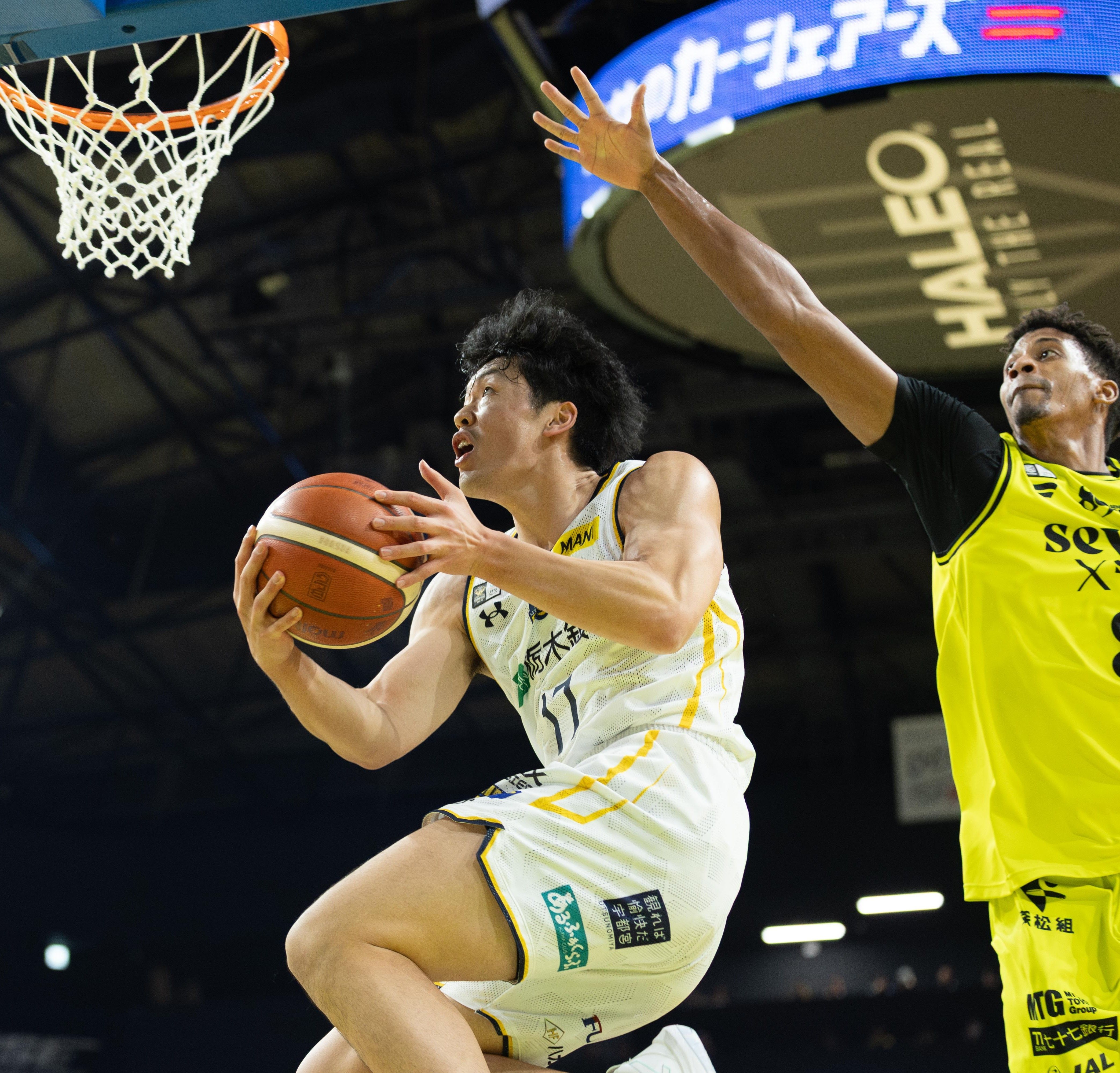 第3クオーター4分、ブレックスの星川がブロックをかわし華麗にシュートを決める=仙台市のゼビオアリーナ仙台