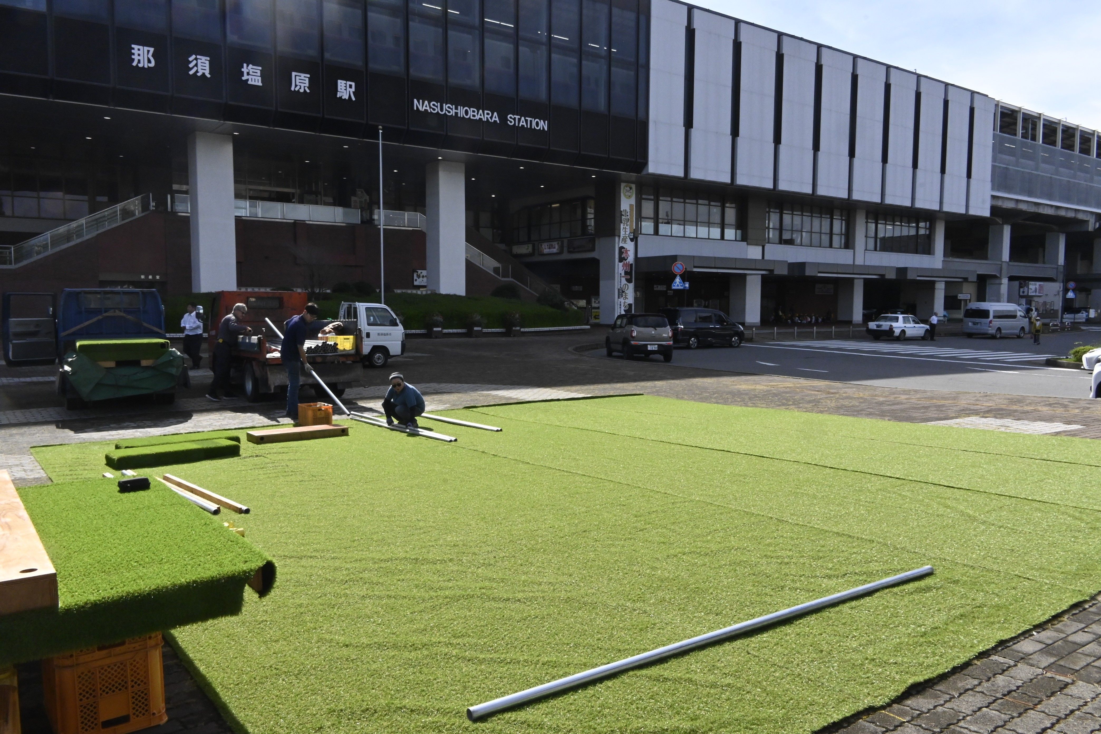 人工芝の設置などが進むJR那須塩原駅西口駅前広場