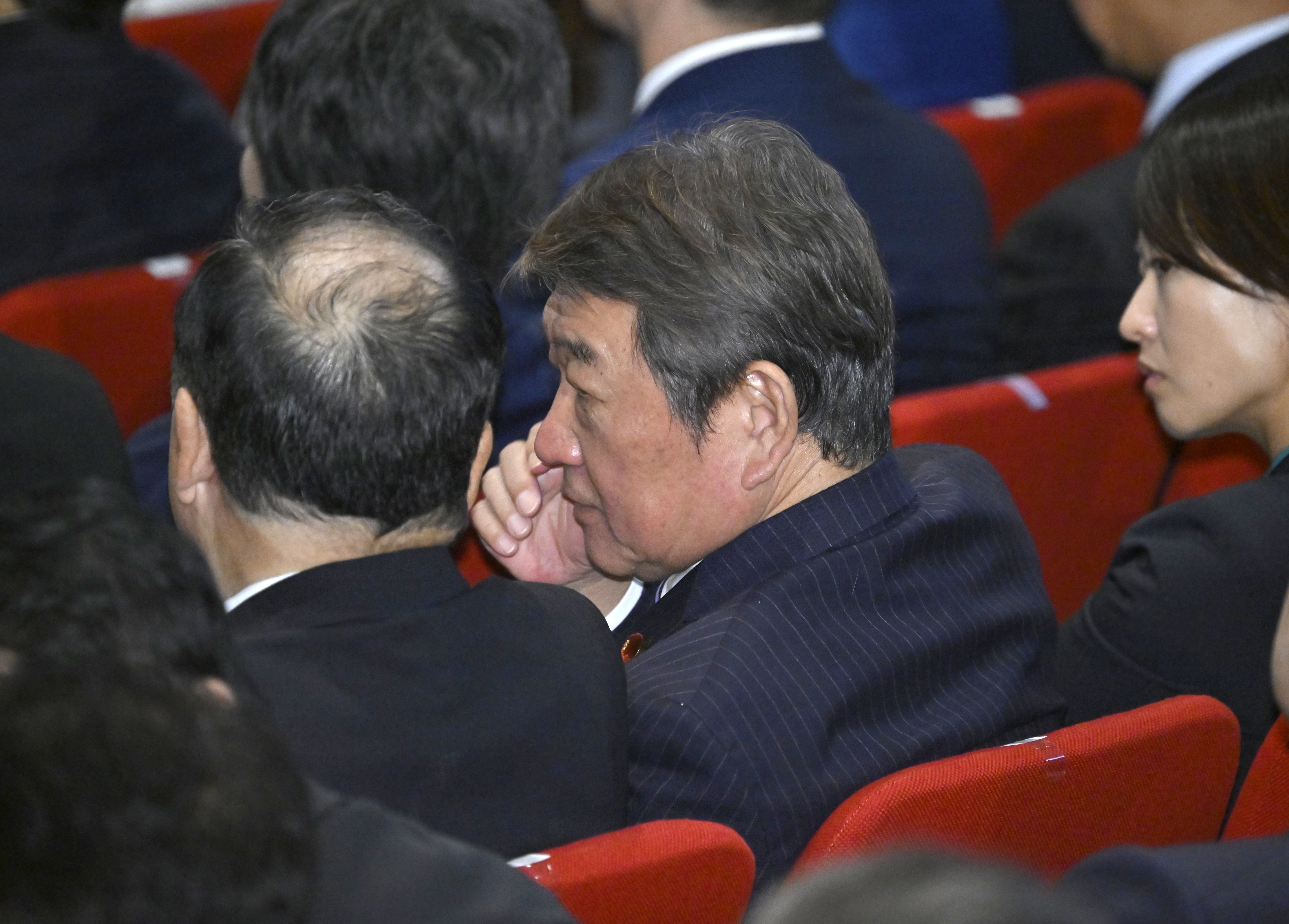 自民党総裁選で5位に終わり、決選投票の開票中に隣席の議員と言葉を交わす茂木氏(中央)=4日午後2時45分、東京・自民党本部、森田大地撮影