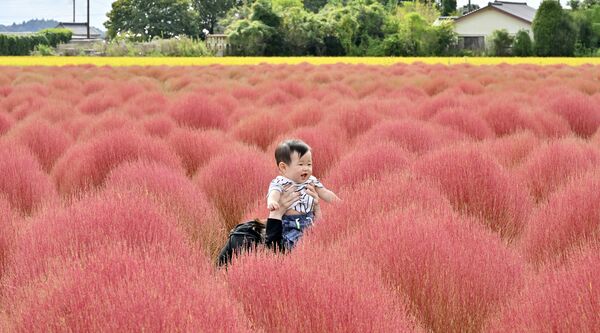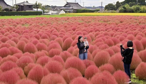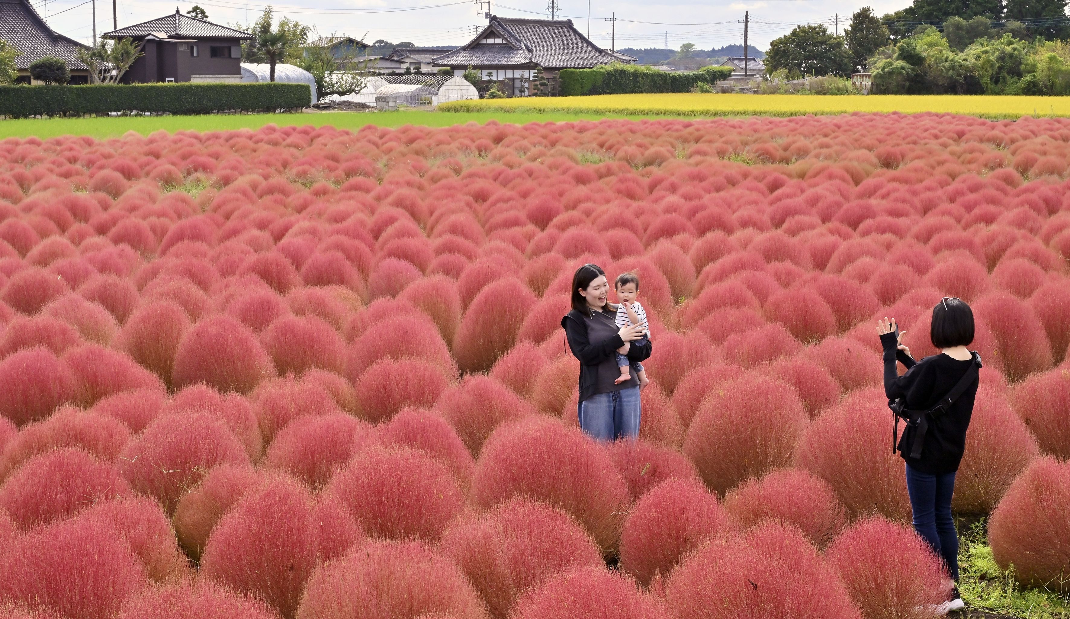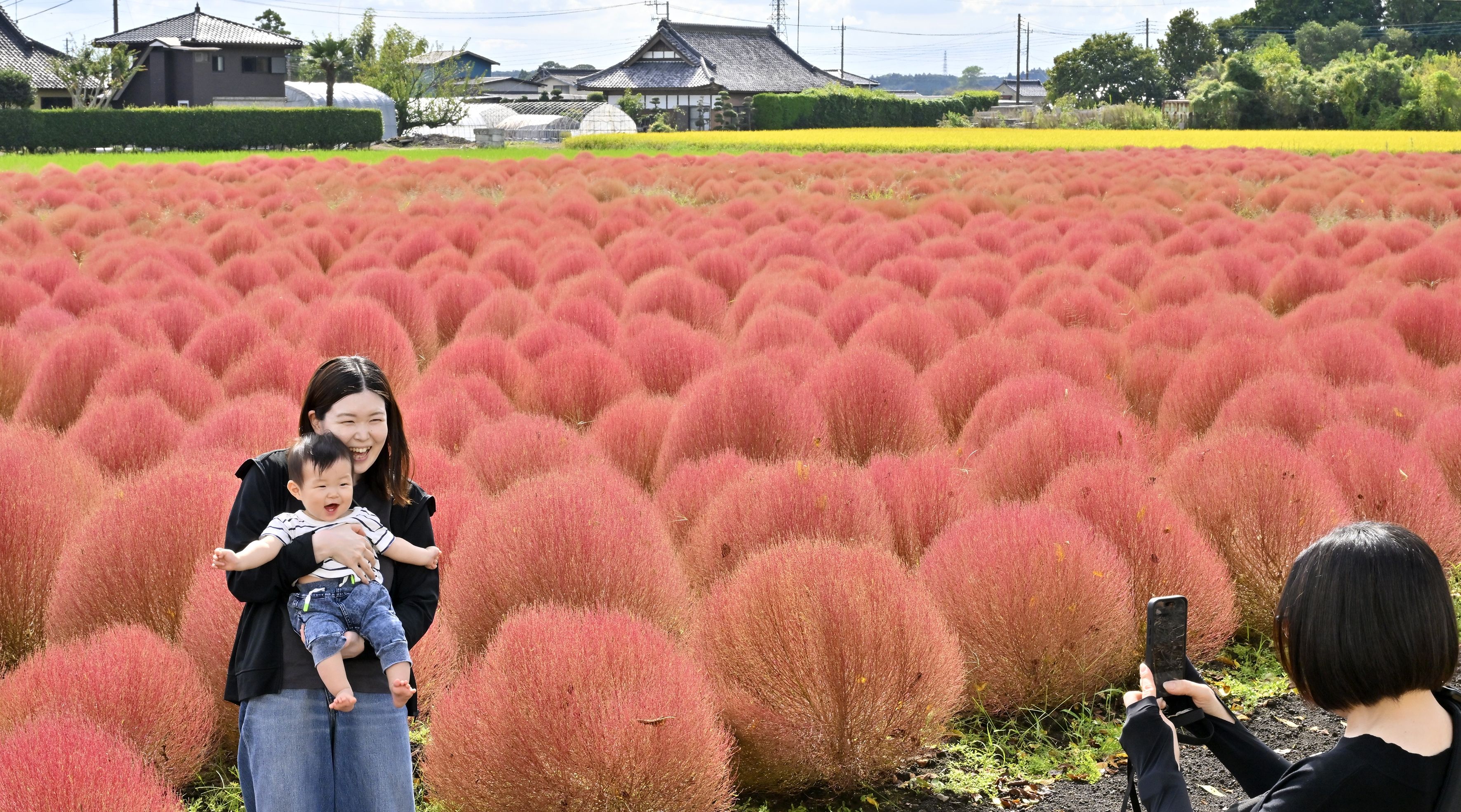 赤く色づいたコキア畑で記念撮影する親子連れ=19日午後1時55分、芳賀町東高橋