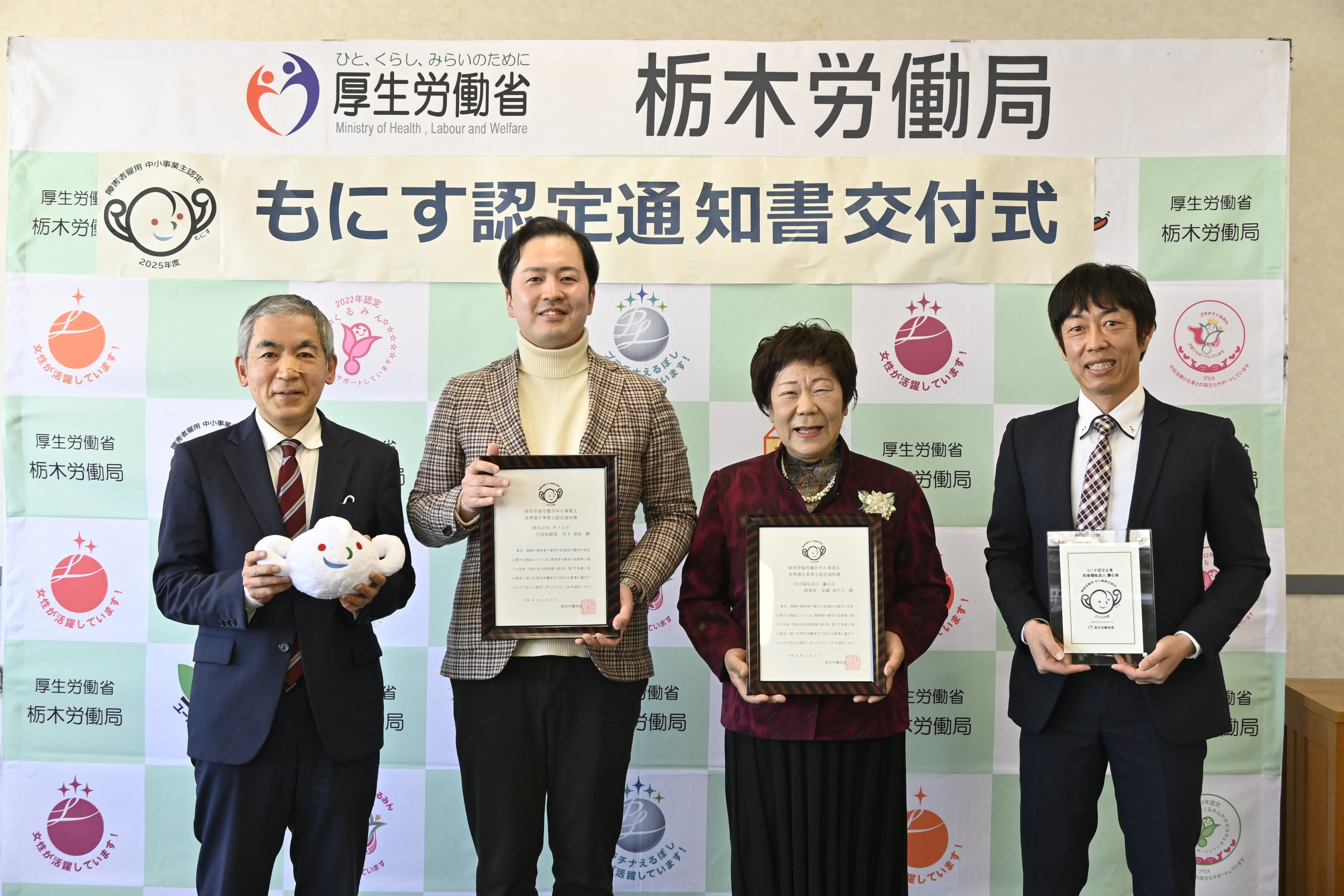 認定通知書を受け取った木下社長(左から2人目)と安藤理事長(同3人目)ら=16日午前、宇都宮市