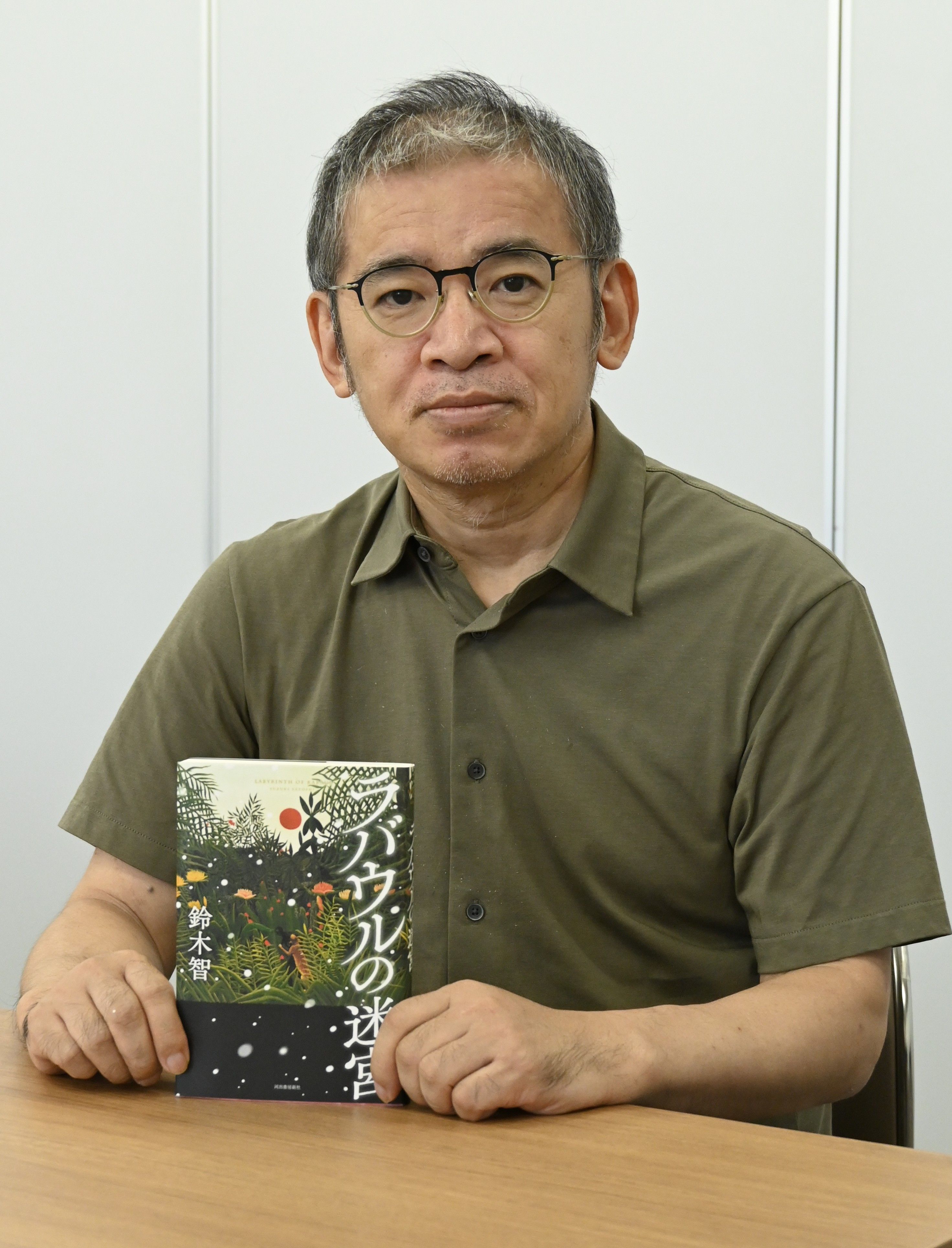 不穏なジャングルをイメージさせる装丁画は自ら選定に当たり、「気に入っています」と鈴木さん=宇都宮市内