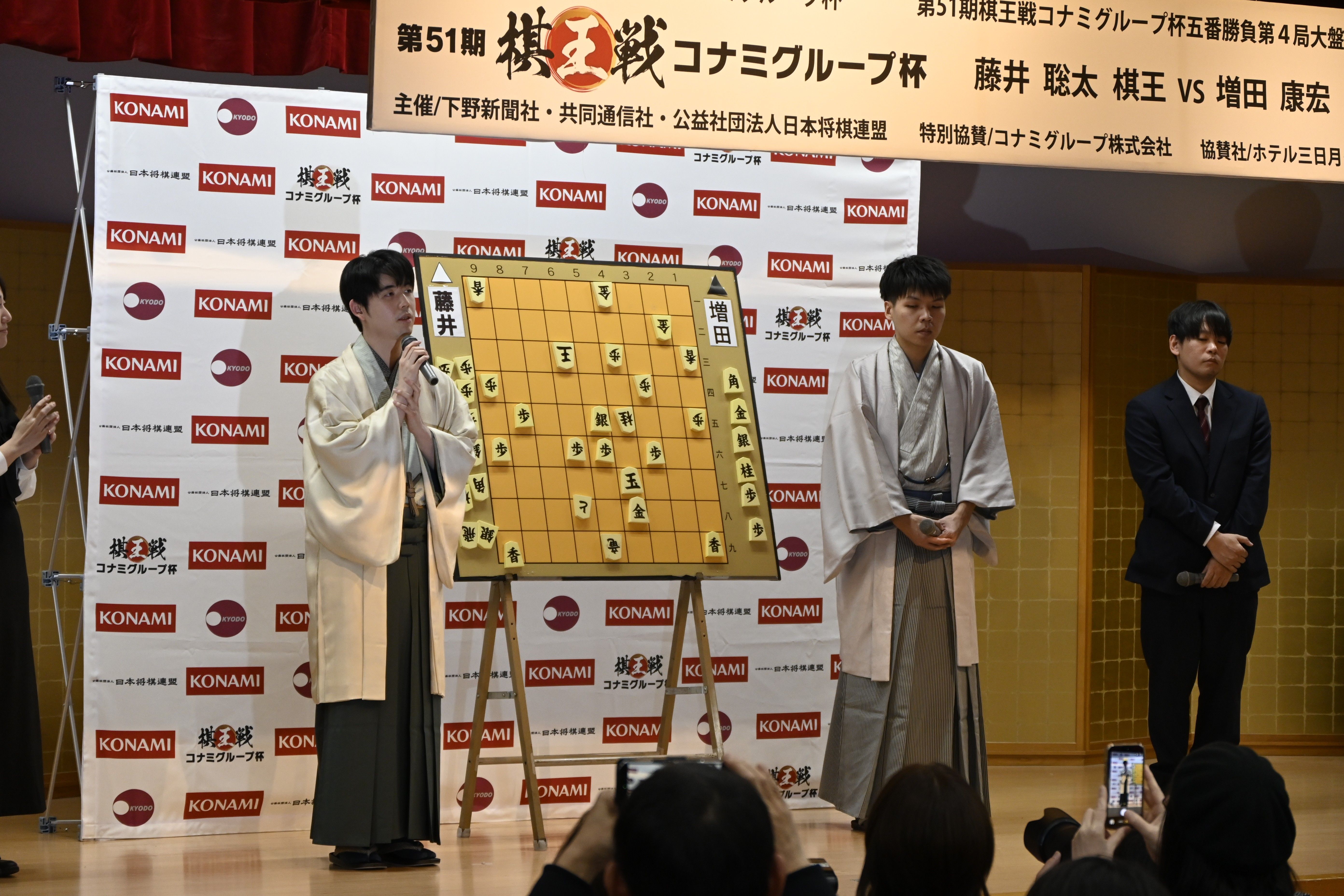 将棋の第51期棋王戦コナミグループ杯5番勝負第4局で、初手を指す増田康宏八段。左は藤井聡太棋王=15日午前、栃木県日光市