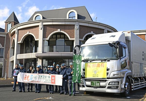 初出荷のビールを乗せたトラックと祝う従業員=5日午後2時15分、那須町高久甲
