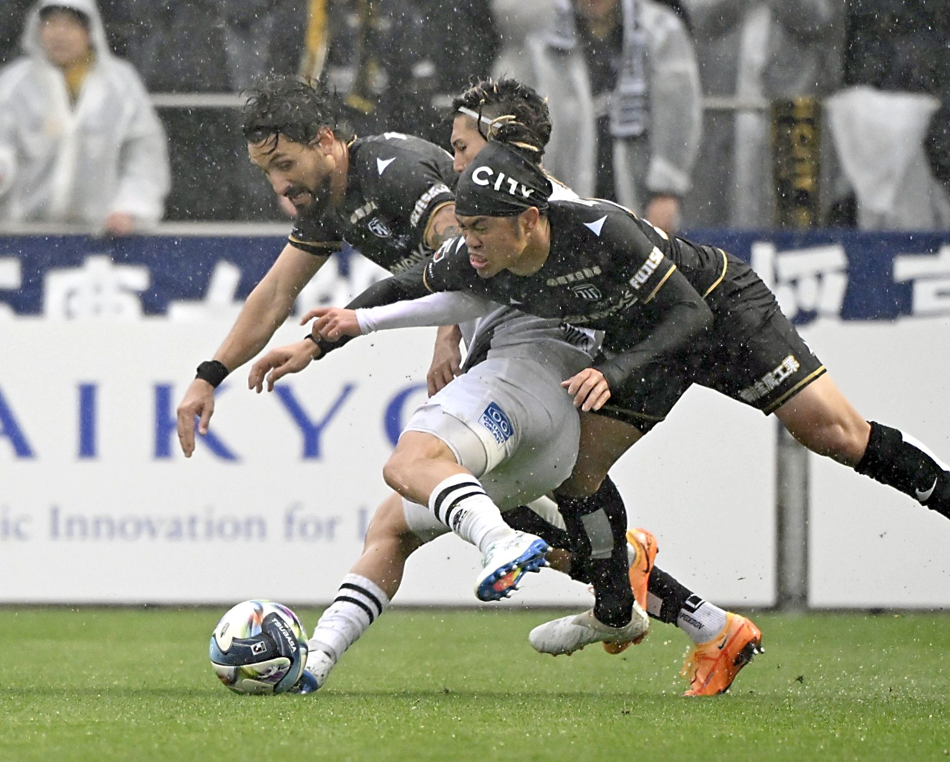 前半14分、栃木シティのMFアウグスト(左)とFW田中(右)がボールを奪いにいく=CFS、森田大地撮影