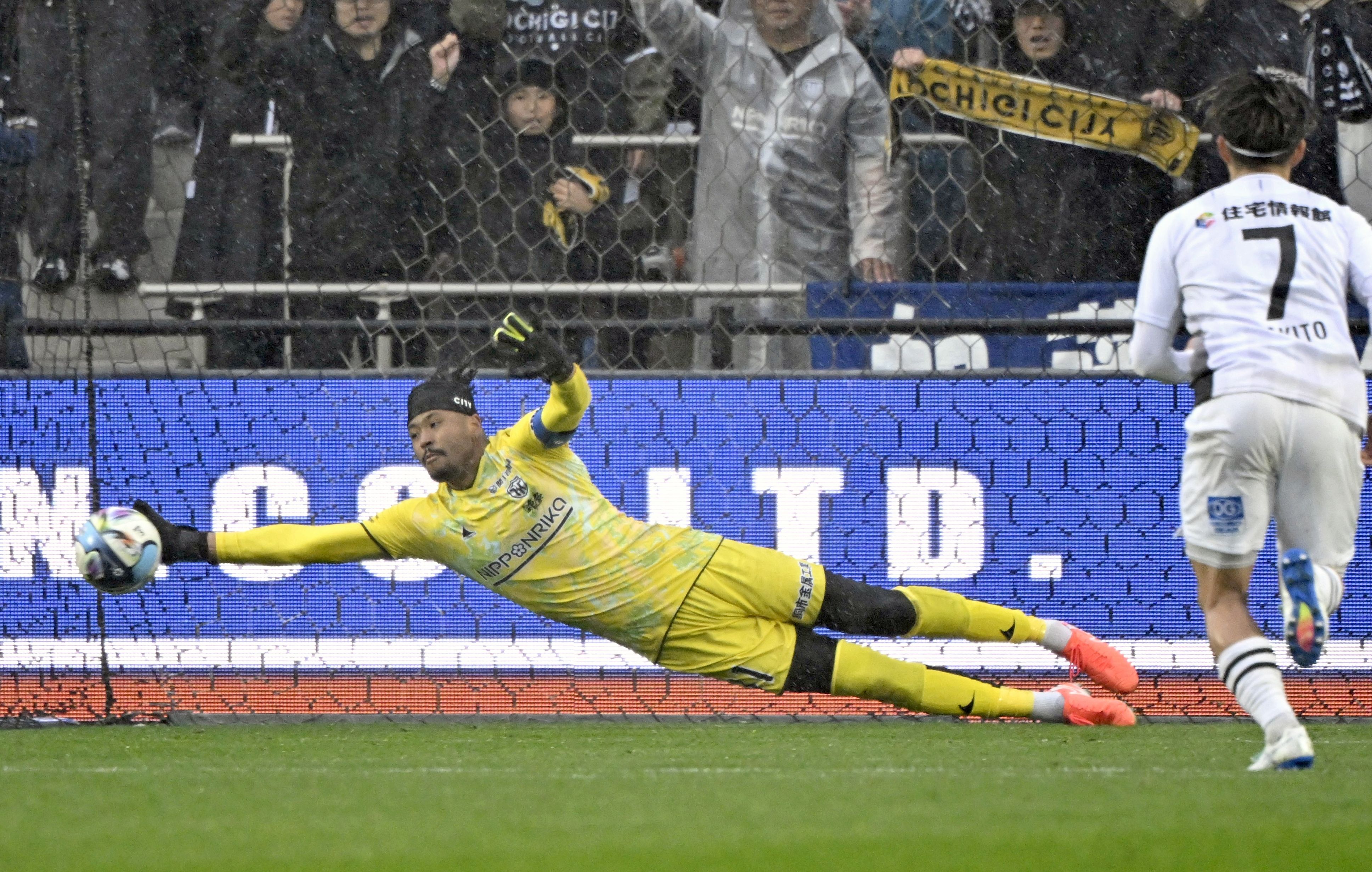 前半7分、栃木シティのGK相澤がPKを止める=CFS、森田大地撮影