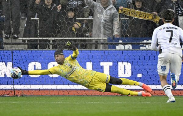 PK戦で栃木シティのGK相澤が1本目を止めて拳を握る=CFS、森田大地撮影