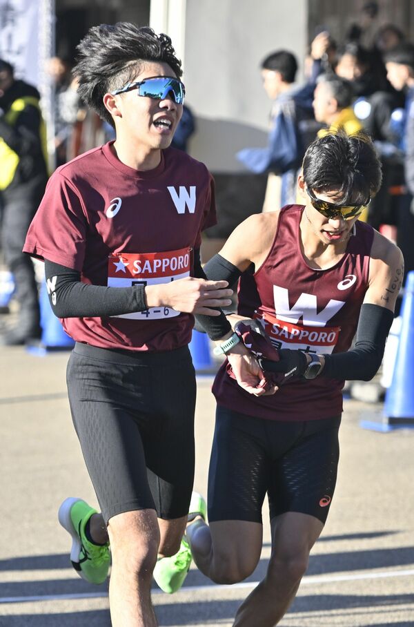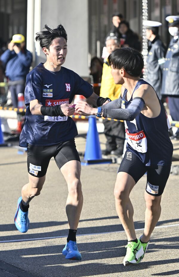 メンバー変更で6区を走った日大の山口聡(左)=神奈川県小田原市