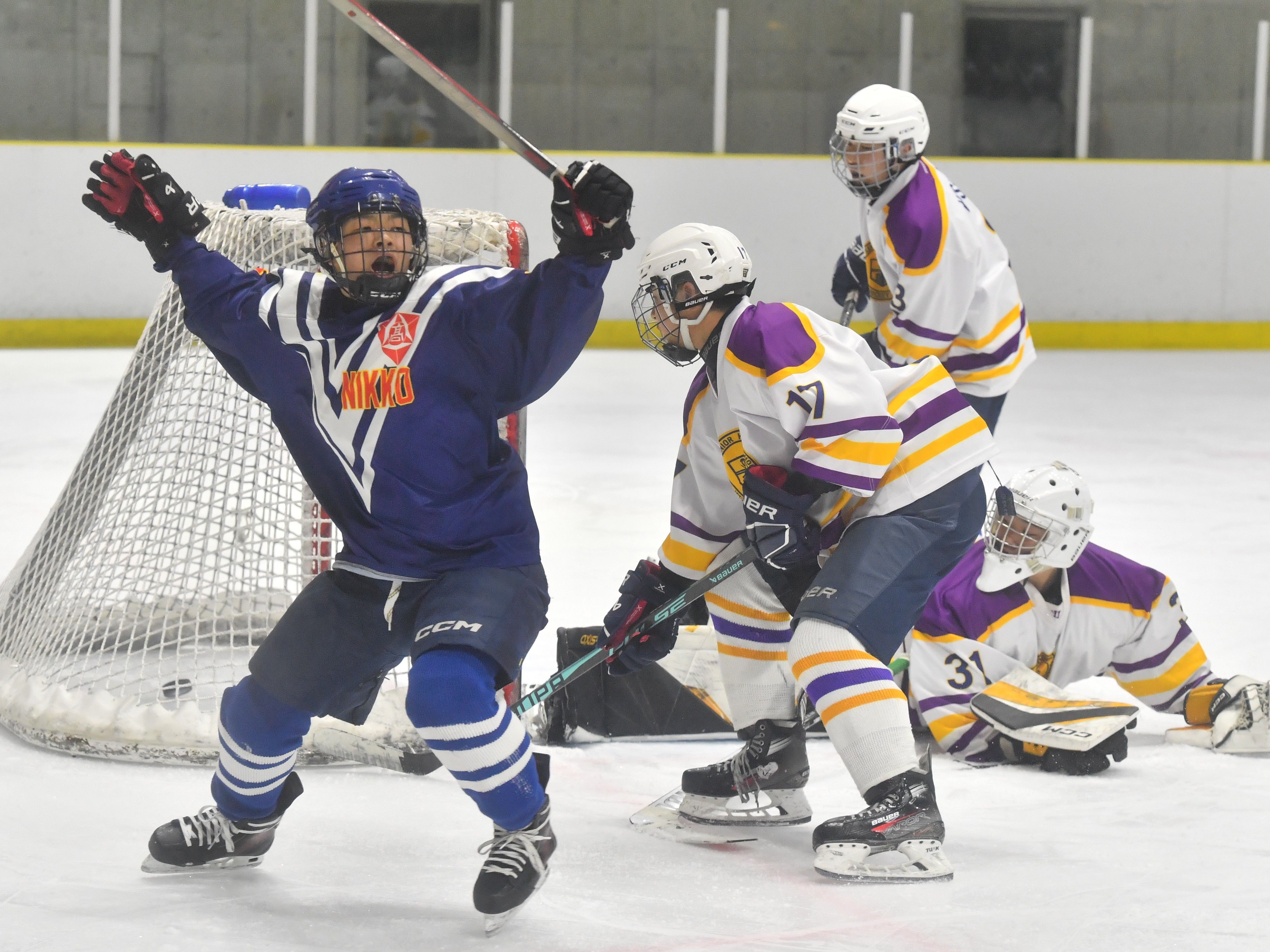 第2ピリオド15分、日光明峰のFW徳永(左)がゴールを決めて喜ぶ=日光霧降アイスアリーナ、鈴木航撮影