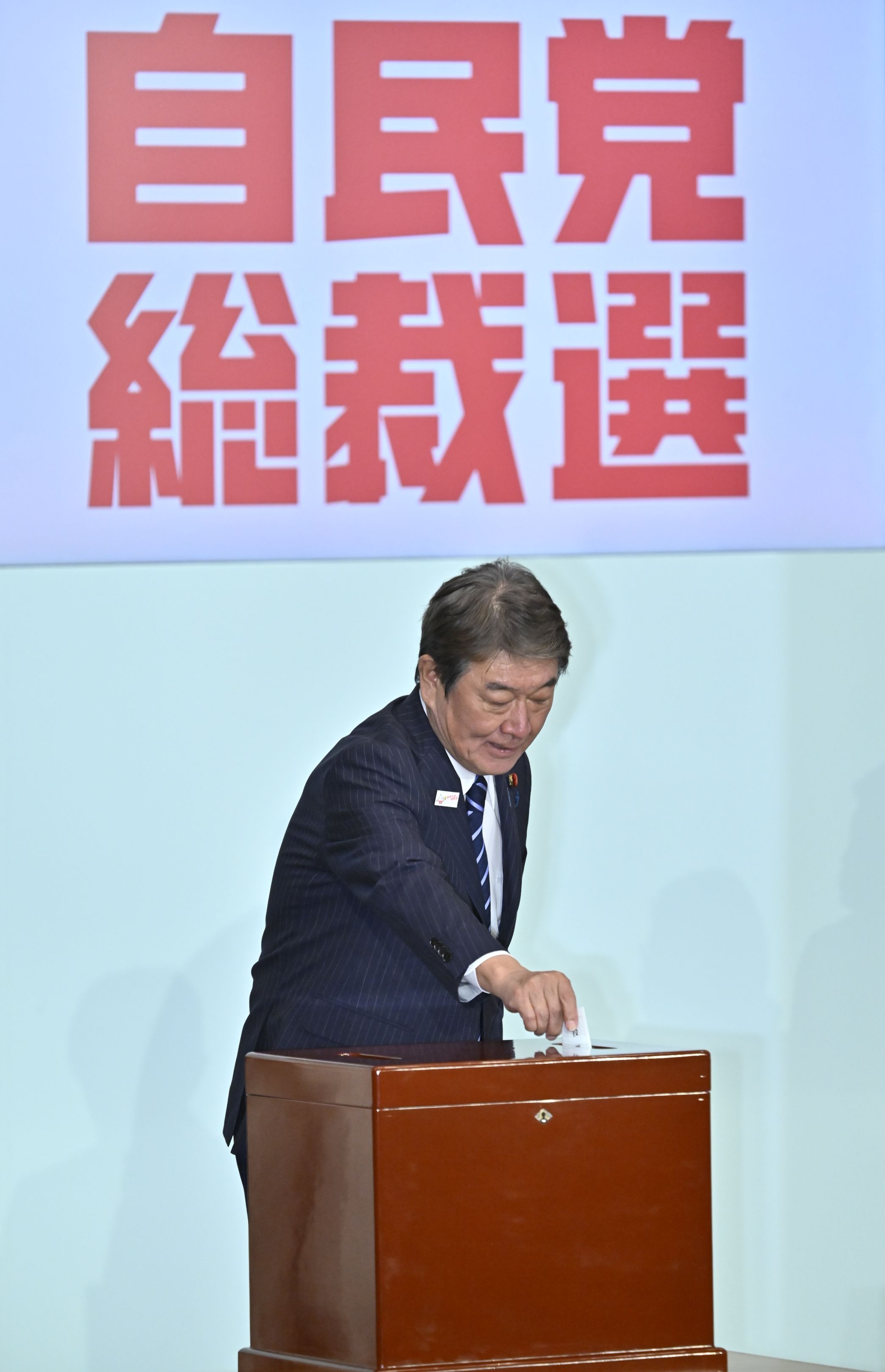 自民党総裁選で票を投じる茂木氏=4日午後、自民党本部、森田大地撮影