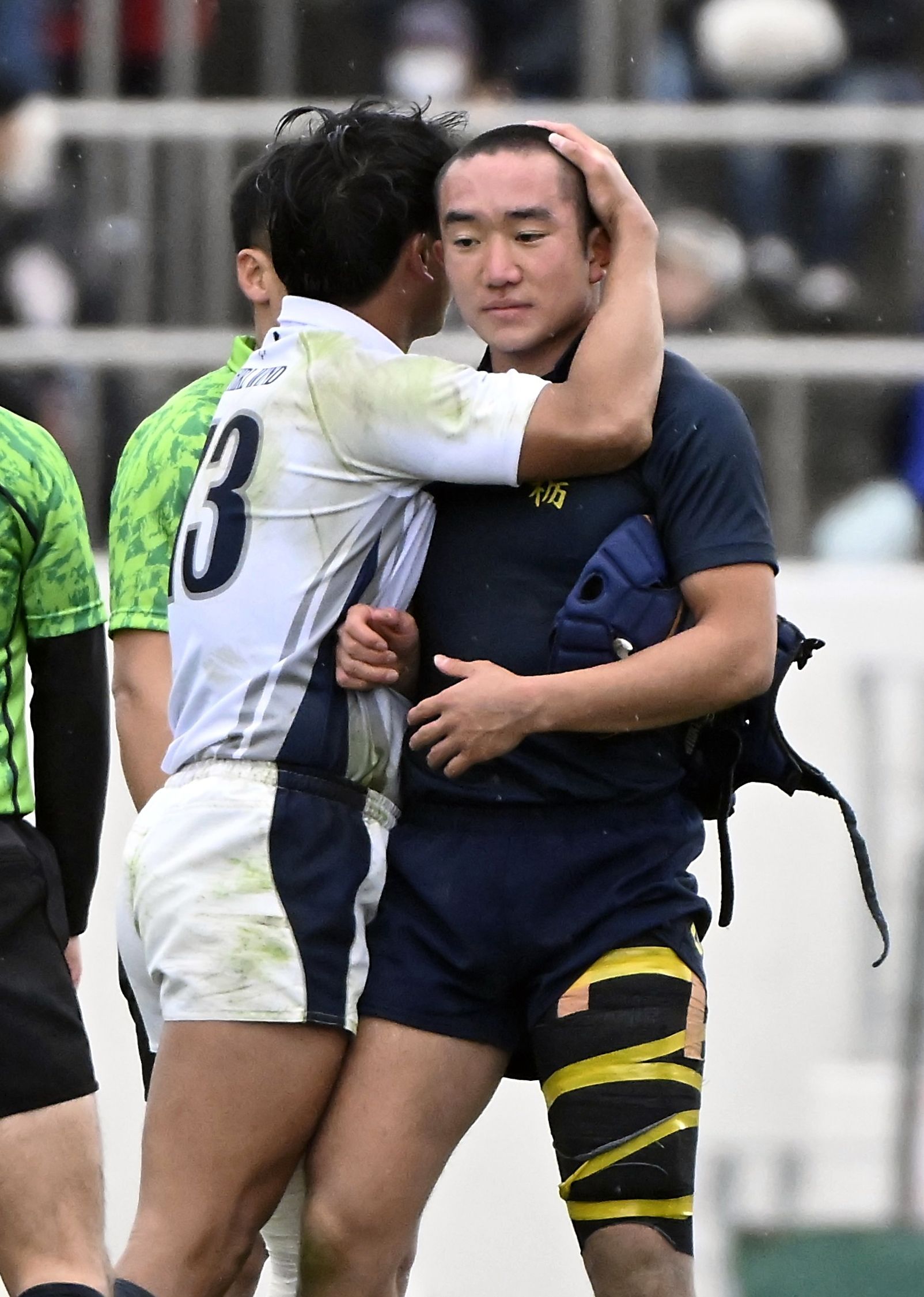 準々決勝で敗退し、大阪桐蔭の主将から励まされる国学栃木のCTB福田主将