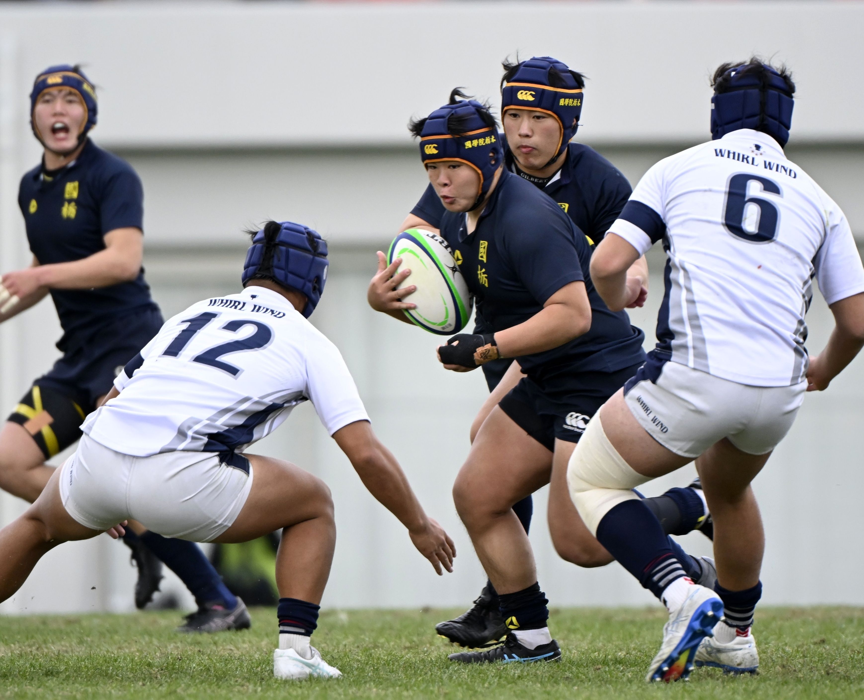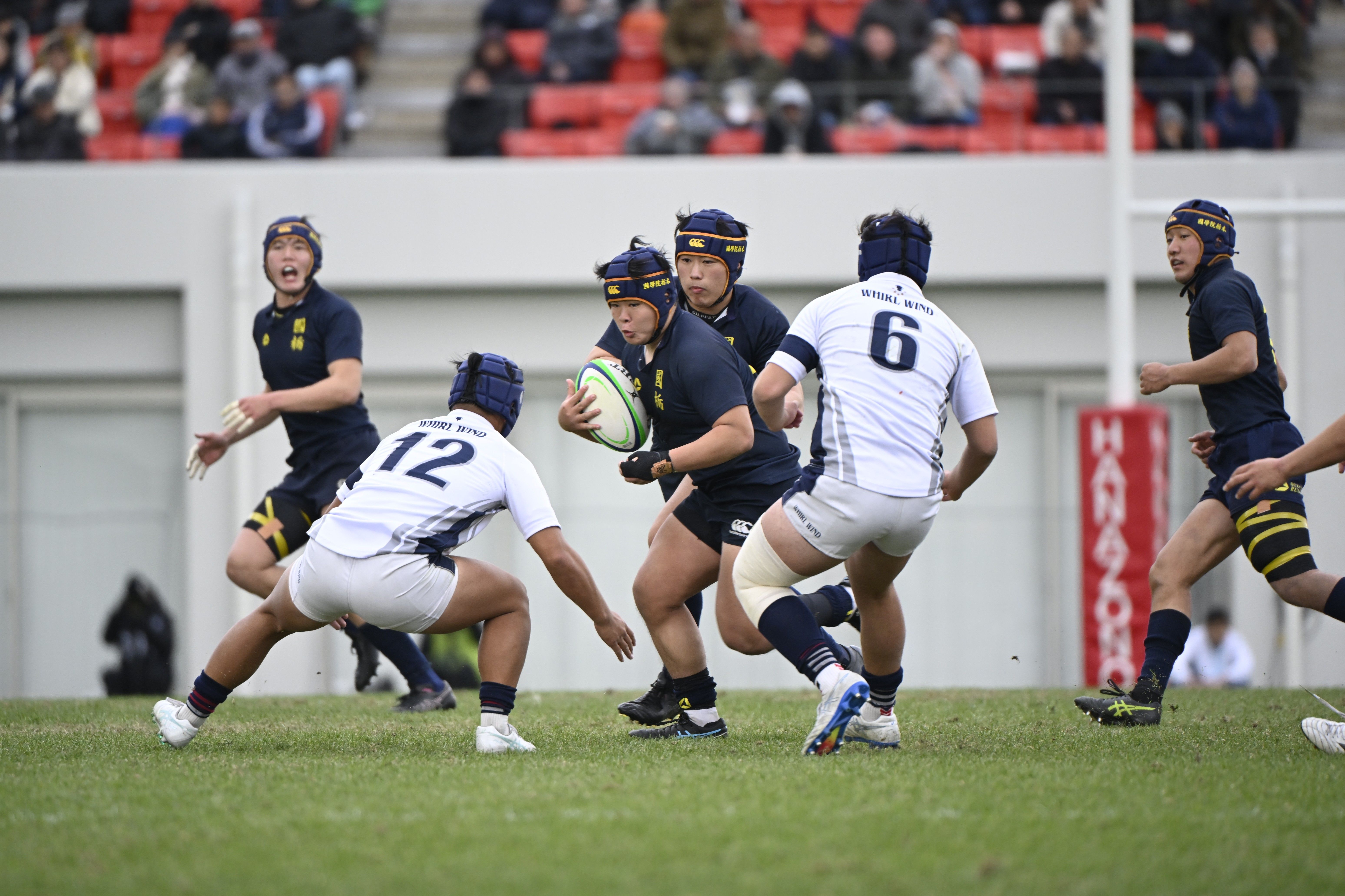 前半ロスタイム、国学栃木のナンバー8椎名(中央)が突破を図る=花園ラグビー場