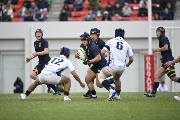 前半ロスタイム、国学栃木のナンバーエイト椎名(中央)が突破を図る=花園ラグビー場、森田大地撮影
