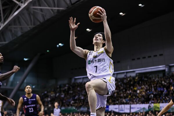 第1クオーター、ブレックスの小川がシュートを決める=横浜国際プール