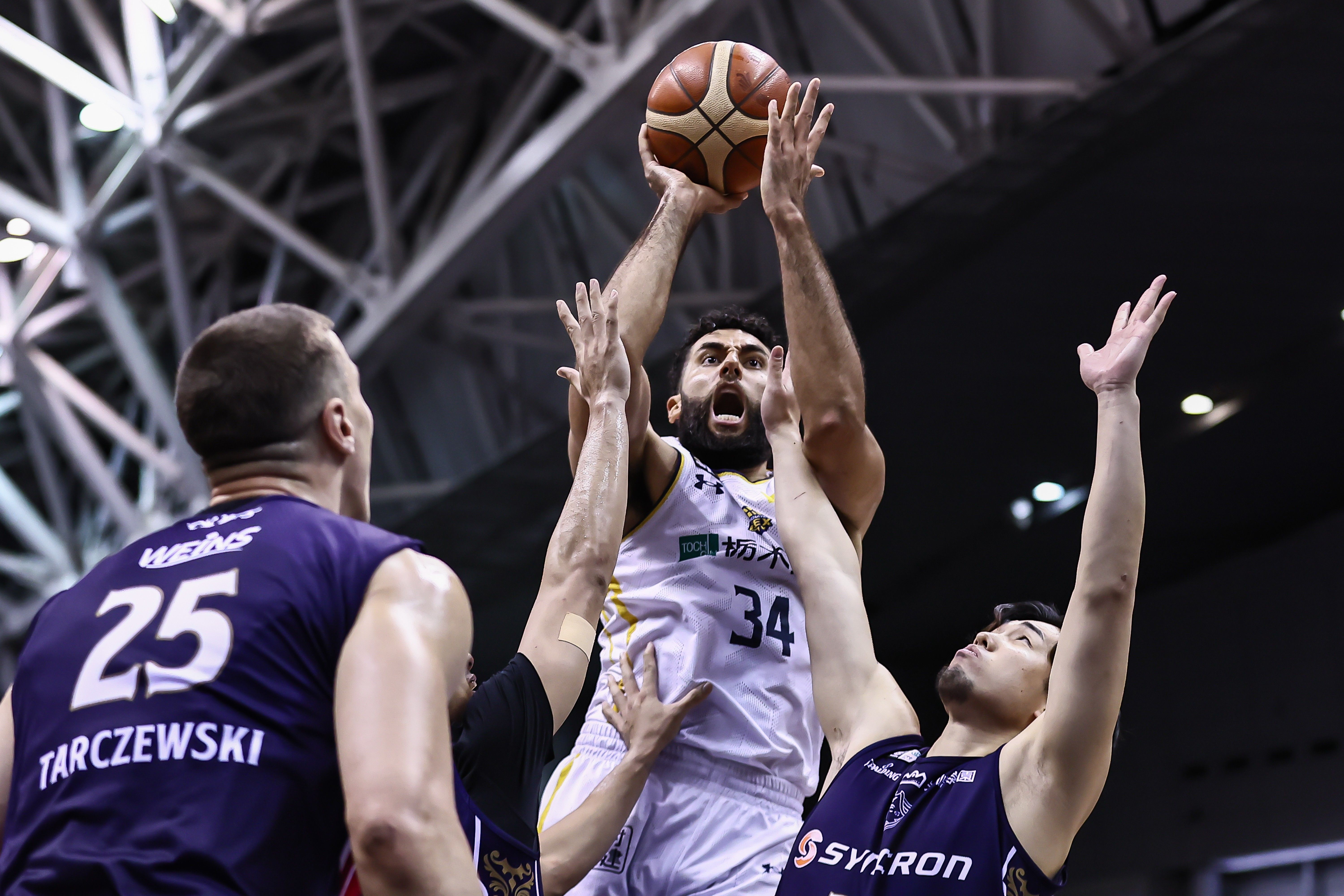 第2クオーター、ブレックスのジェレットがシュートを放つ=横浜国際プール