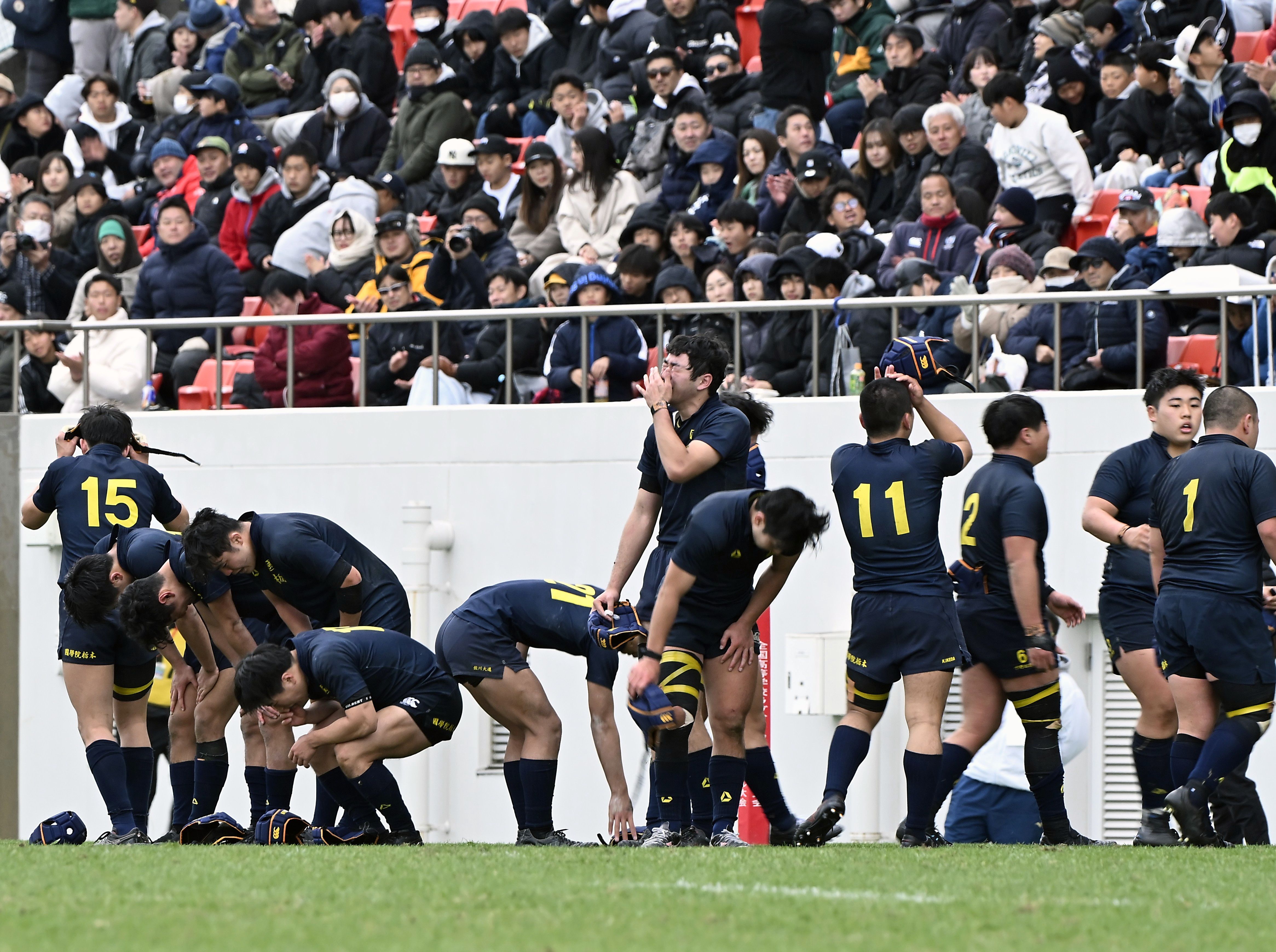 2年連続の準決勝進出を逃し、肩を落とす国学栃木の選手たち=花園ラグビー場、森田大地撮影