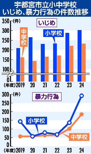 宇都宮市立小中学校 暴力行為が倍増、いじめも過去10年で最多 暴力は9校に集中、繰り返す児童生徒も
