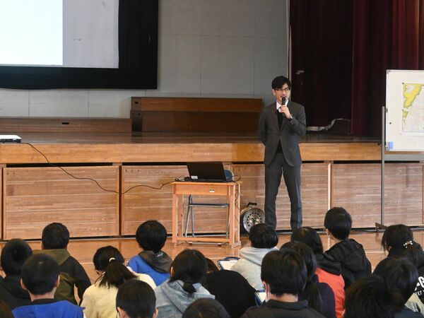 児童の前で講話する沖本さん=17日午前、宇都宮市戸祭1丁目