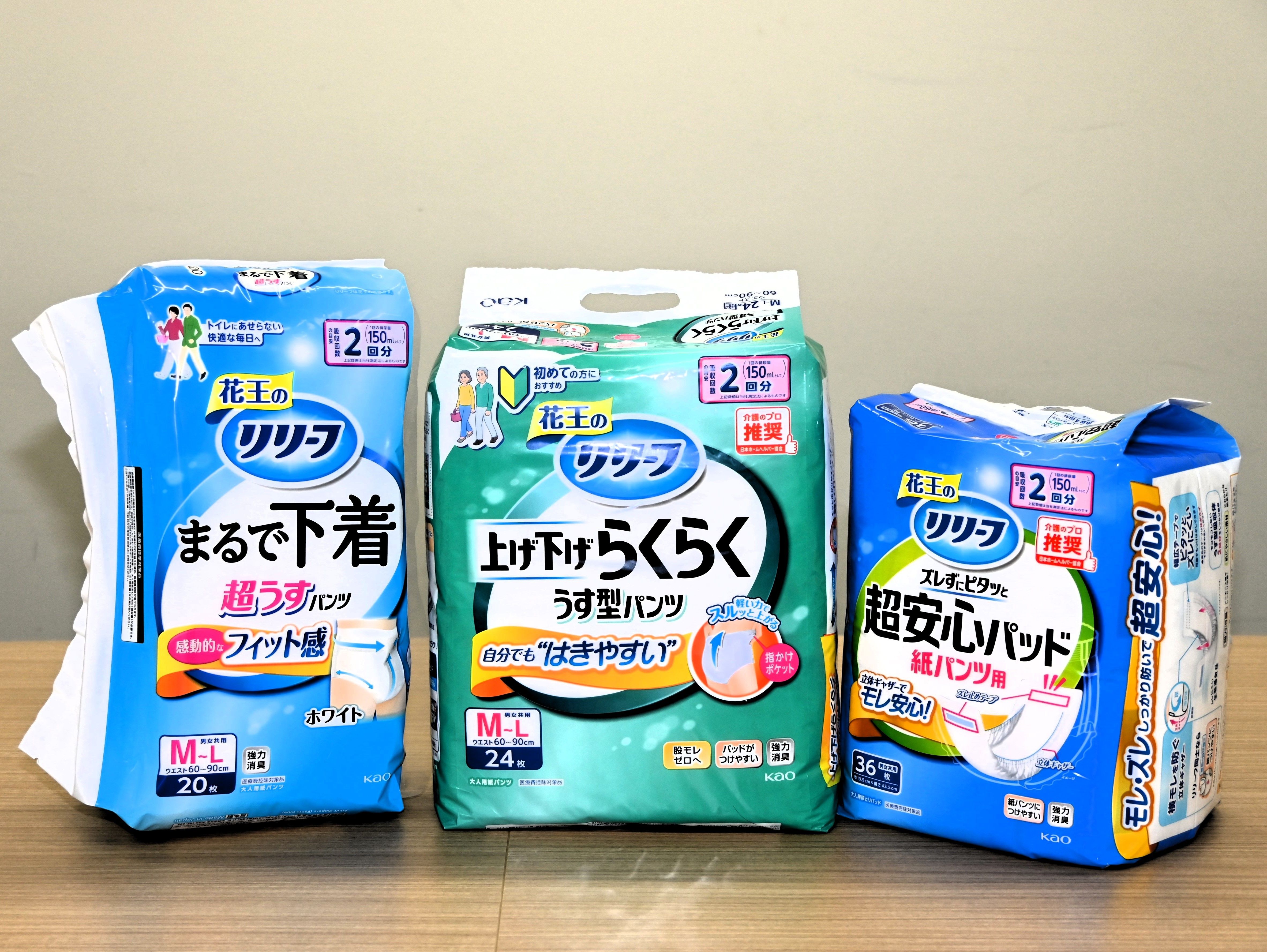 「上げ下げらくらく うす型パンツ」(中央)など、大人用紙おむつ「リリーフ」シリーズの一部