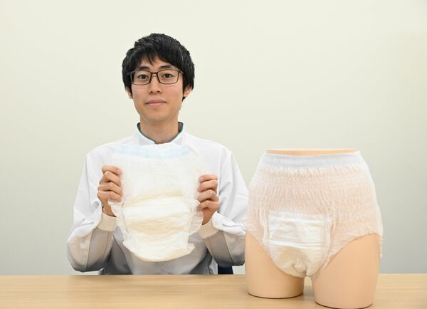 「リリーフ 上げ下げらくらく うす型パンツ」を手にする研究員の伊藤さん=市貝町