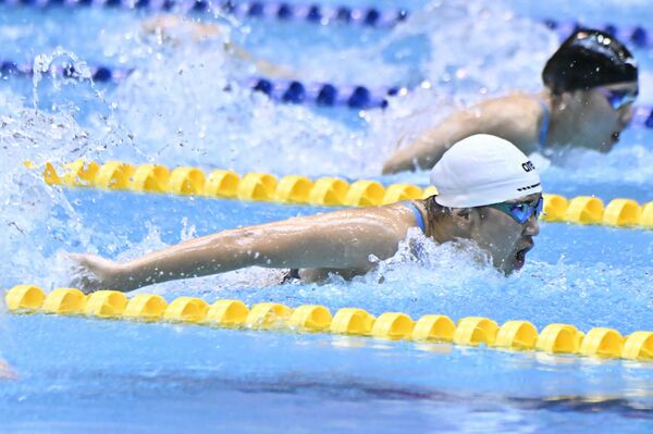 全国高校総体競泳女子100メートルバタフライを制し、東洋大に進む佐野日大の後藤=2025年8月、広島市