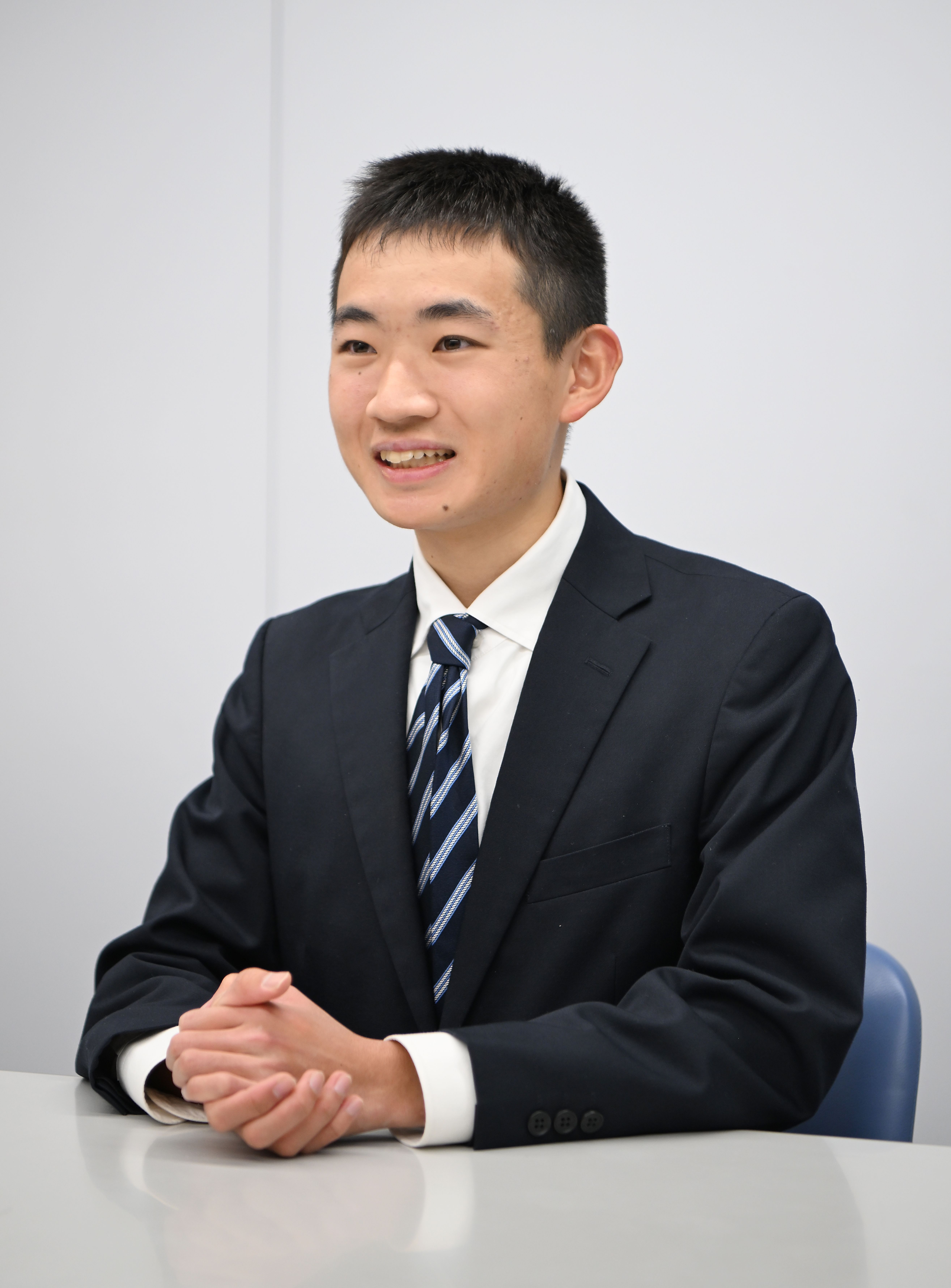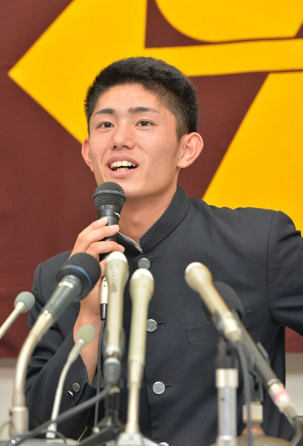 記者会見で喜びを語る今井達也投手=2016年10月20日午後、作新高