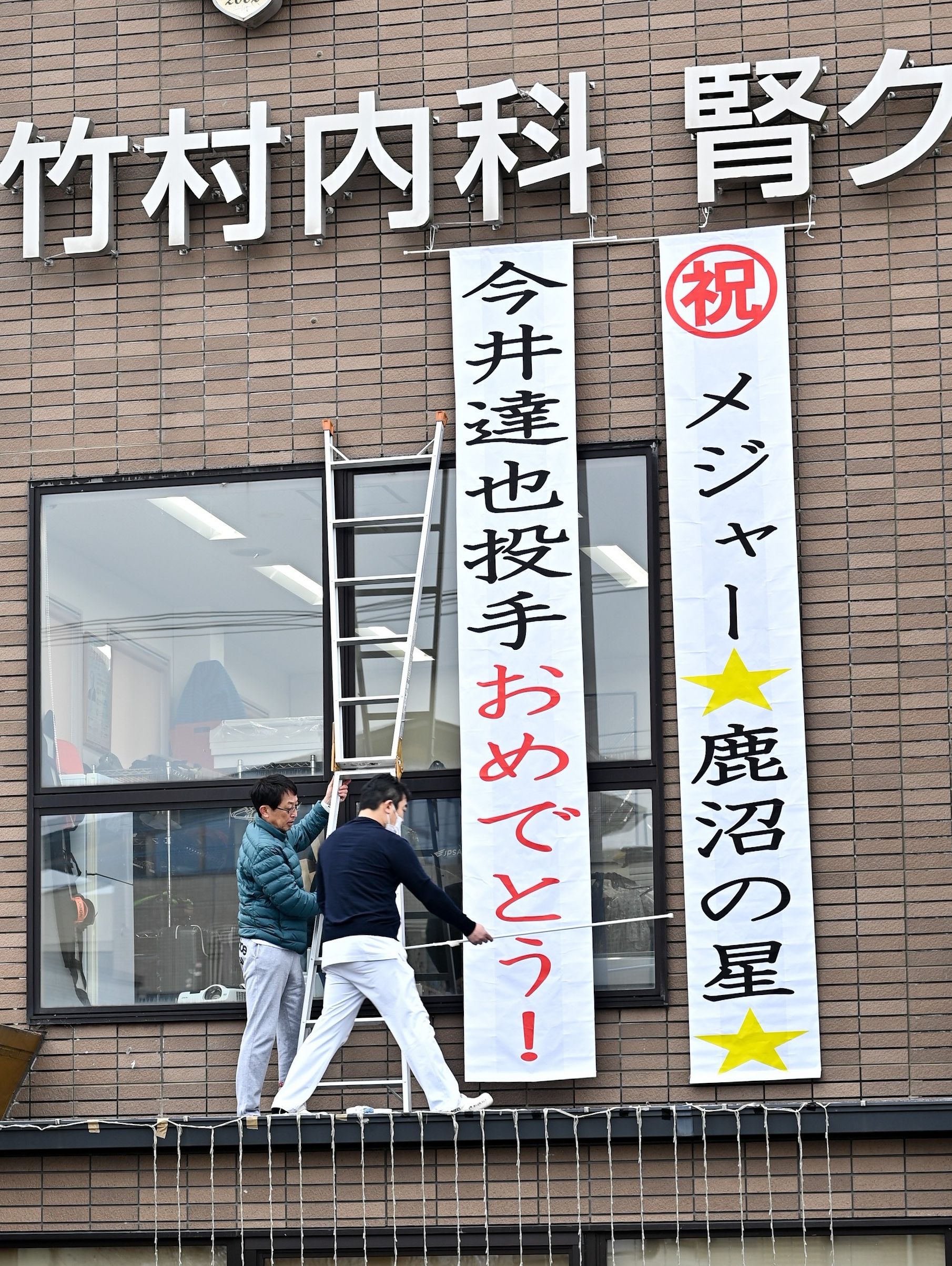 クリニック外壁に掲げられた懸垂幕=2日午前10時半、鹿沼市西茂呂4丁目