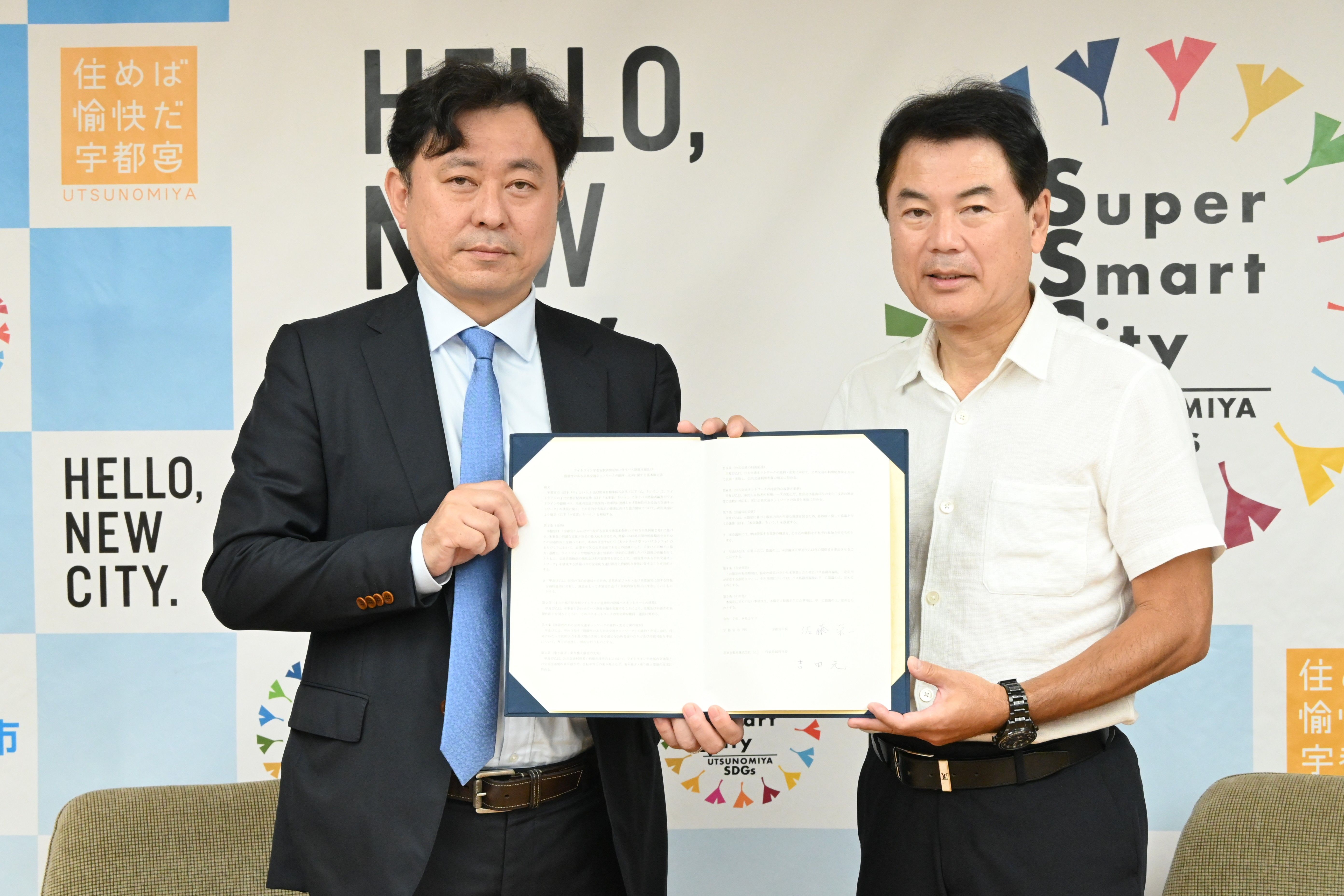 基本協定書を手にする佐藤市長(右)と吉田社長=29日午前、宇都宮市役所