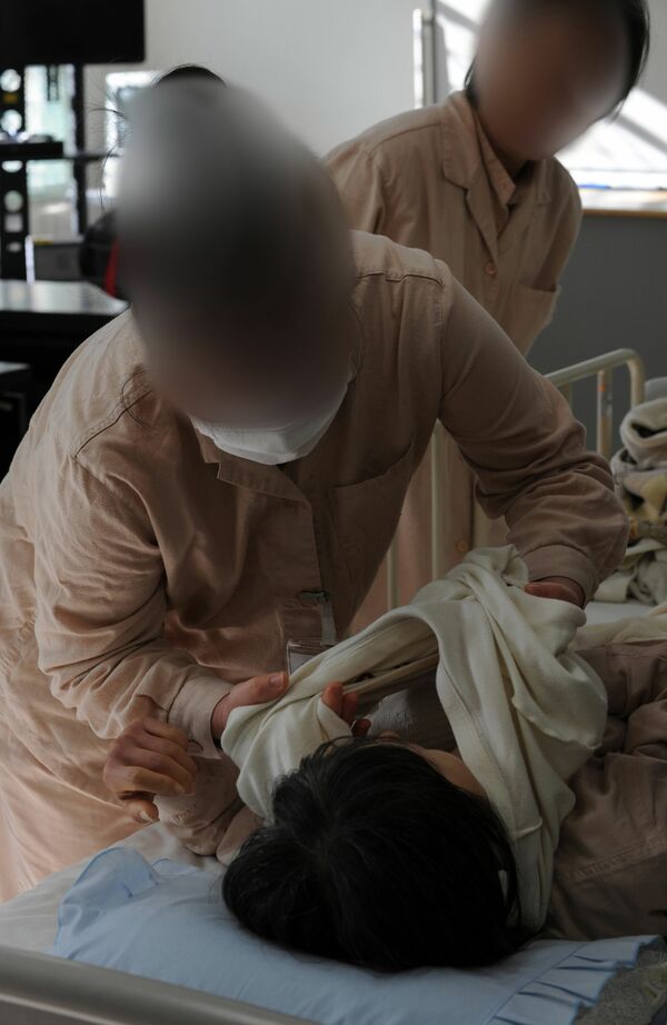 介護職員を目指す職業訓練。受刑者は質問しながら真剣に取り組む=2015年2月3日午前(画像は一部加工しています)