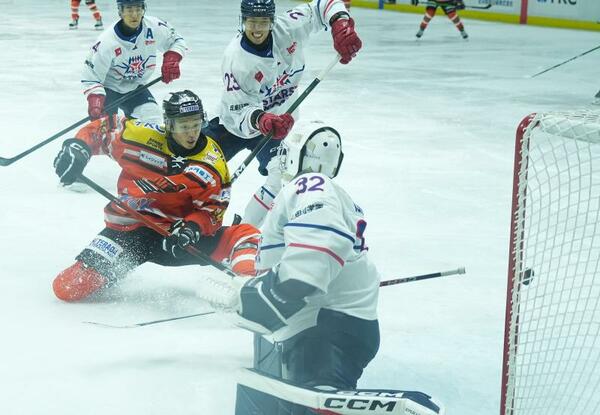第3ピリオド2分59秒、バックスの鈴木円(左)がゴールを決める=日光霧降アイスアリーナ、橋本裕太撮影