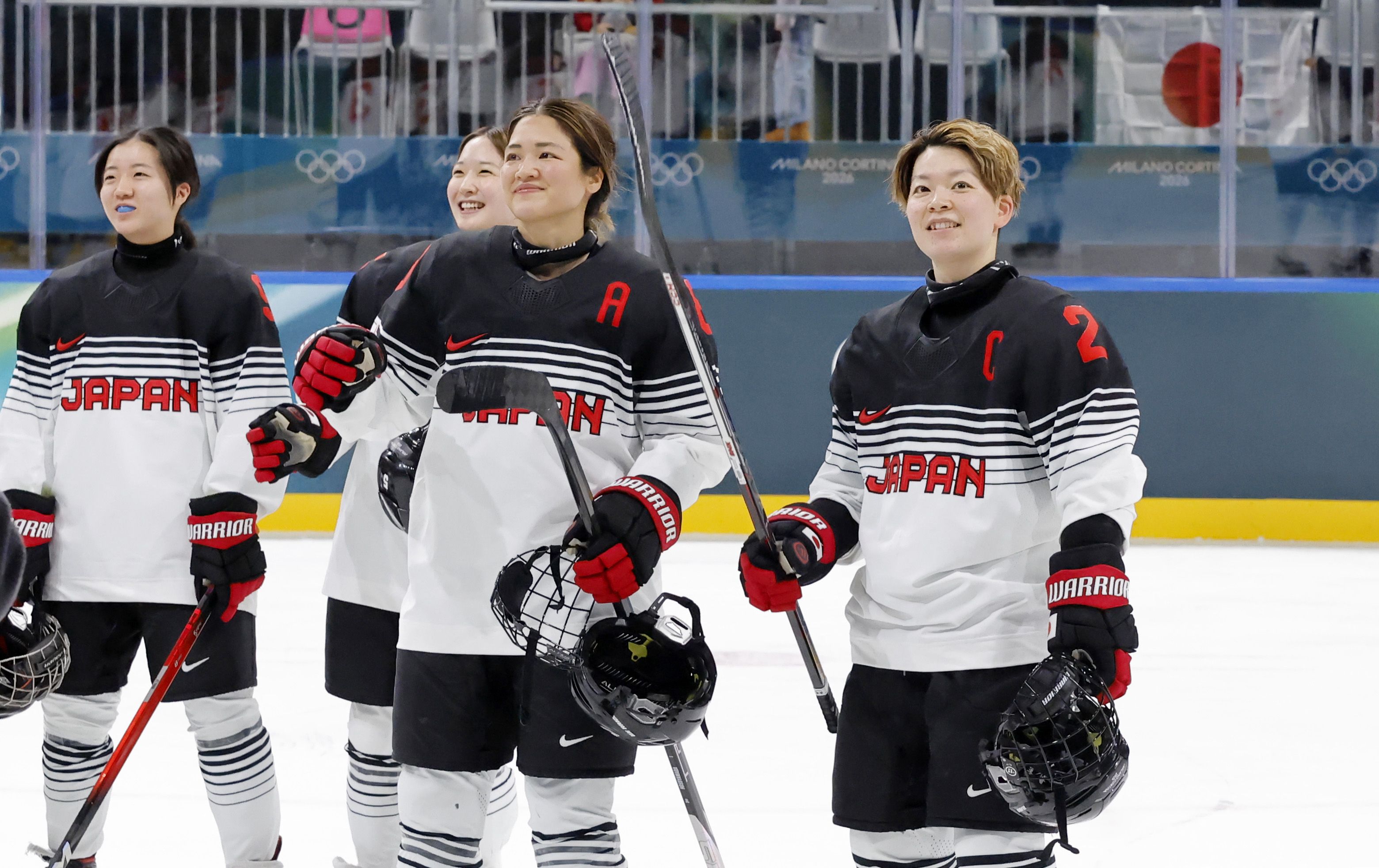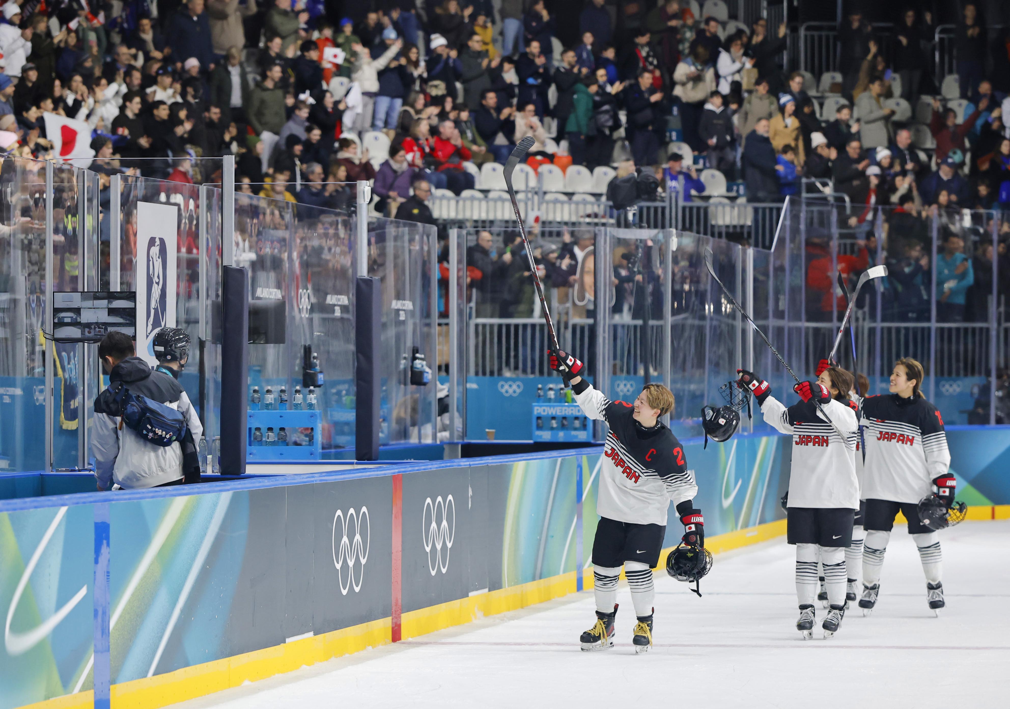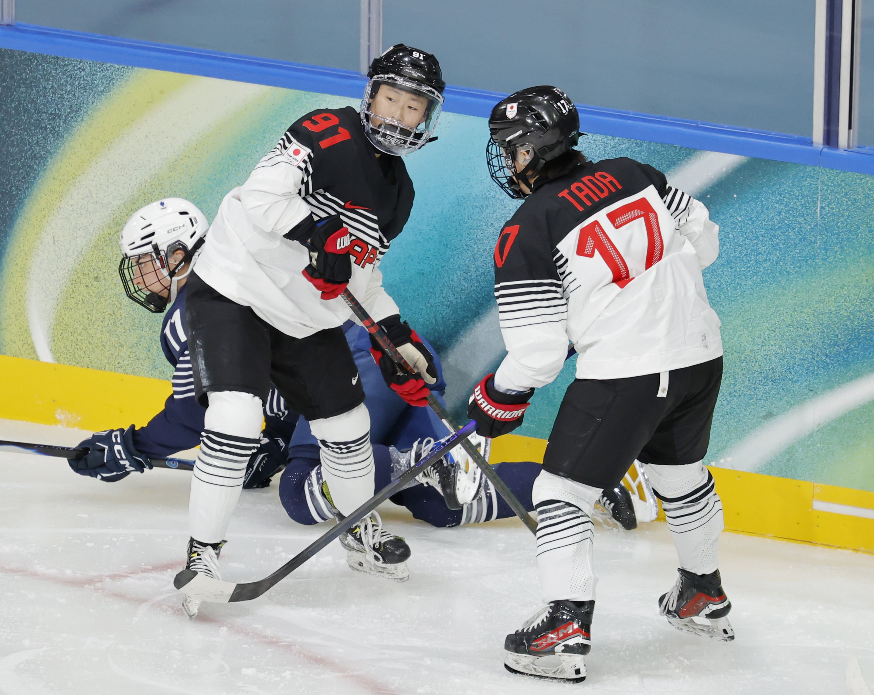 日本-フランス 第1ピリオド、競り合う小平(左)と多田=ミラノ(共同)