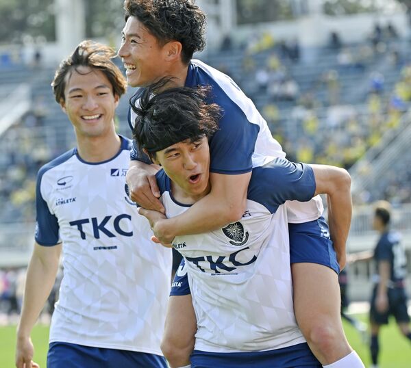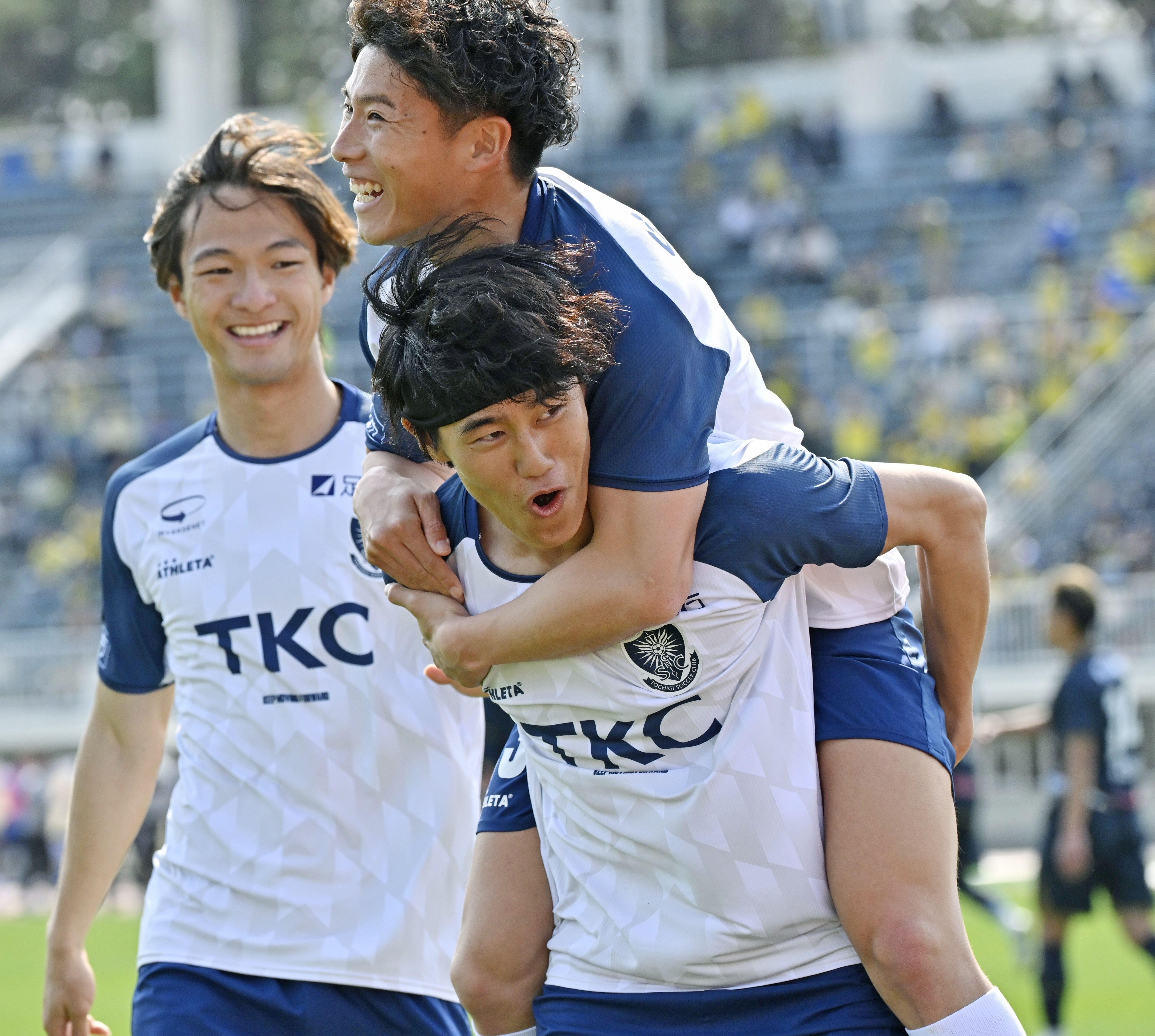 前半9分、先制ゴールを決めて仲間と喜ぶ栃木SCのFW西野(中央下)=前橋市の正田醤油スタジアム群馬、広瀬華撮影