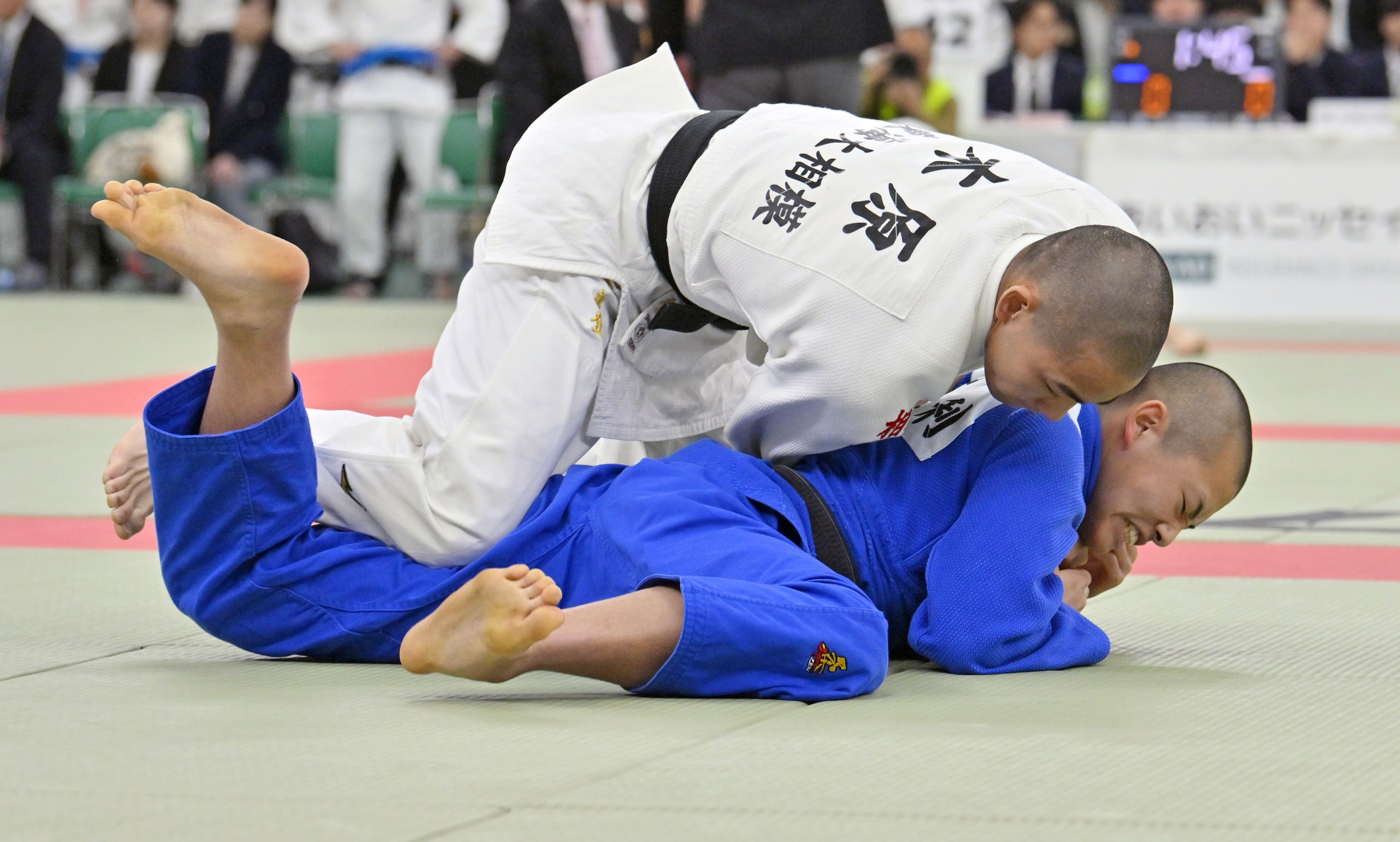 男子66キロ級3回戦 寝技を受け、踏ん張る白鴎足利の君島(下)=日本武道館、磯真奈美撮影