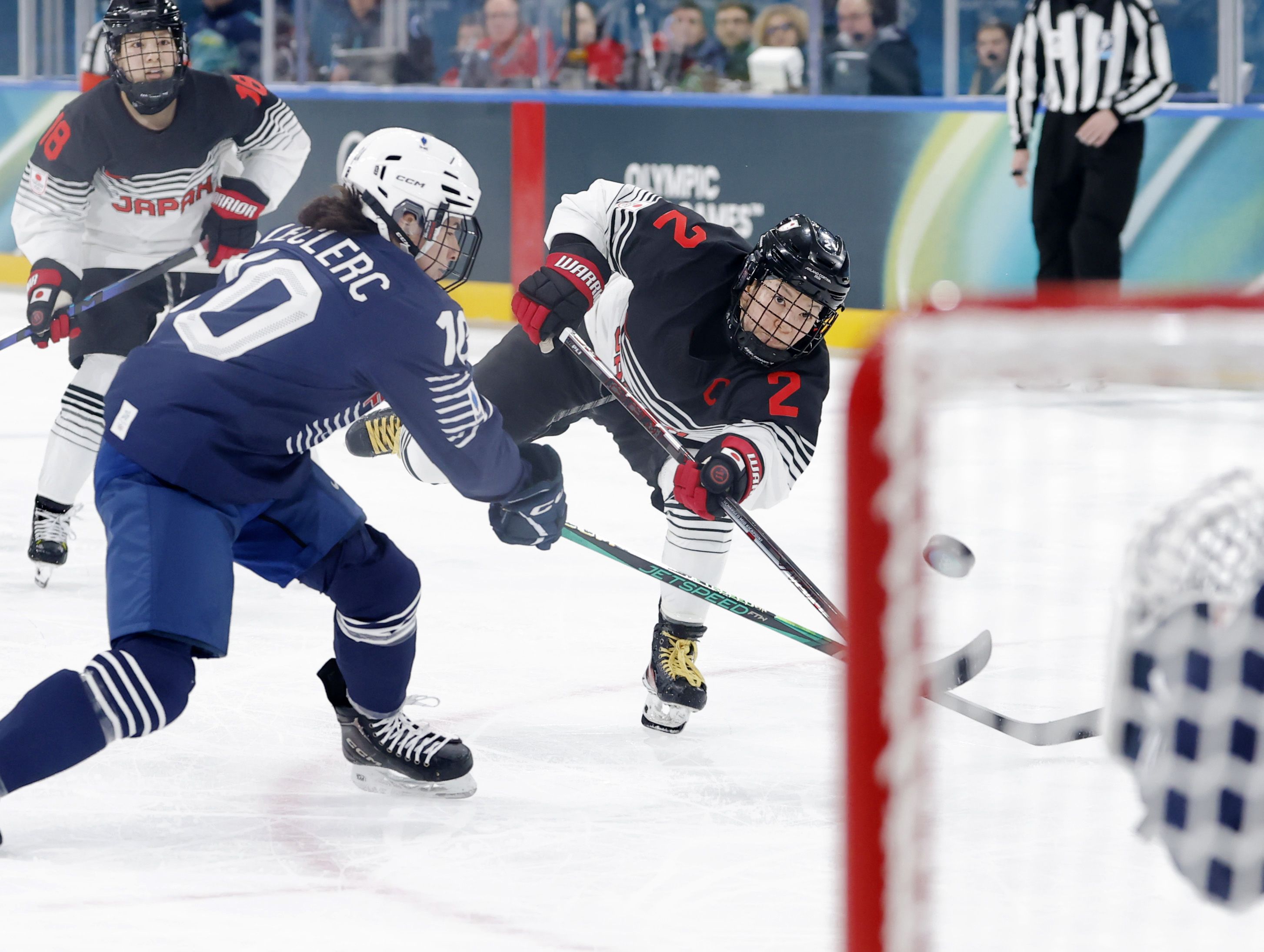 日本-フランス 第2ピリオド、ゴールを狙う小池(2)=ミラノ(共同)