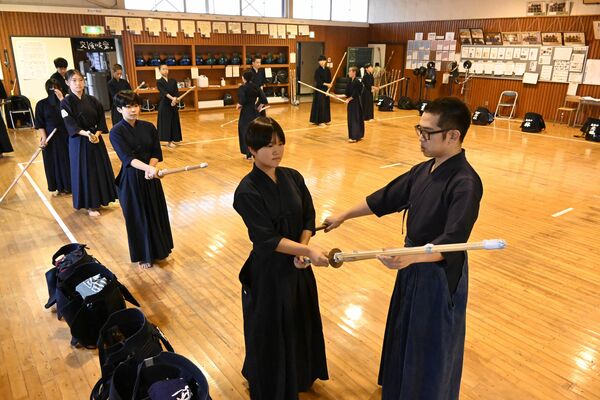 出展される結城紬の着物を制作した紬織士の澤田さん(左)と浅野市長