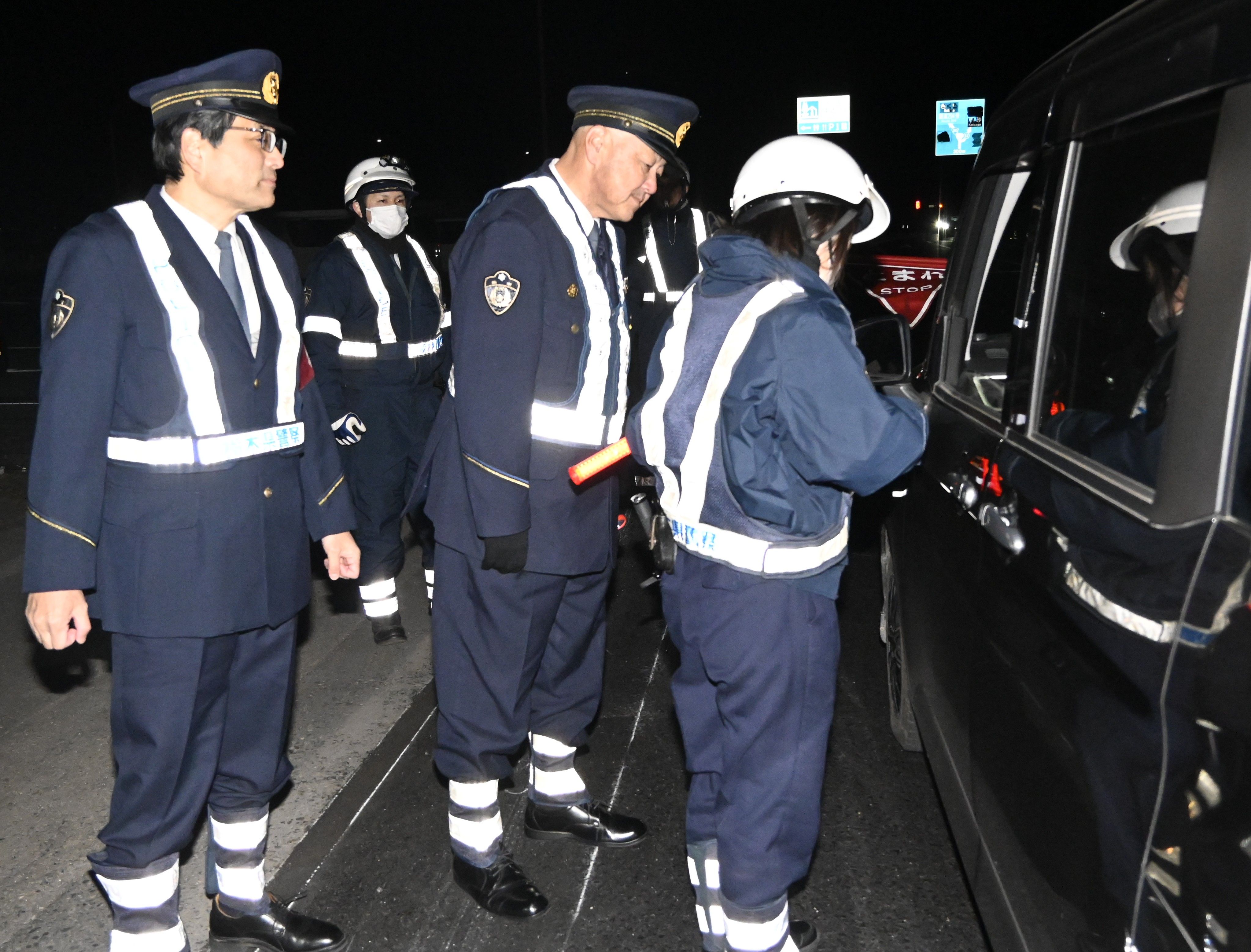 検問を巡視する中島那珂川署長(左)と高橋交通部長(左から2番目)と=12日午後7時20分、那珂川町北向田