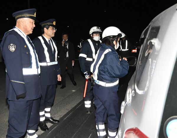 検問を巡視する高橋交通部長(左)と中島那珂川署長(中央)=12日午後7時半、那珂川町北向田