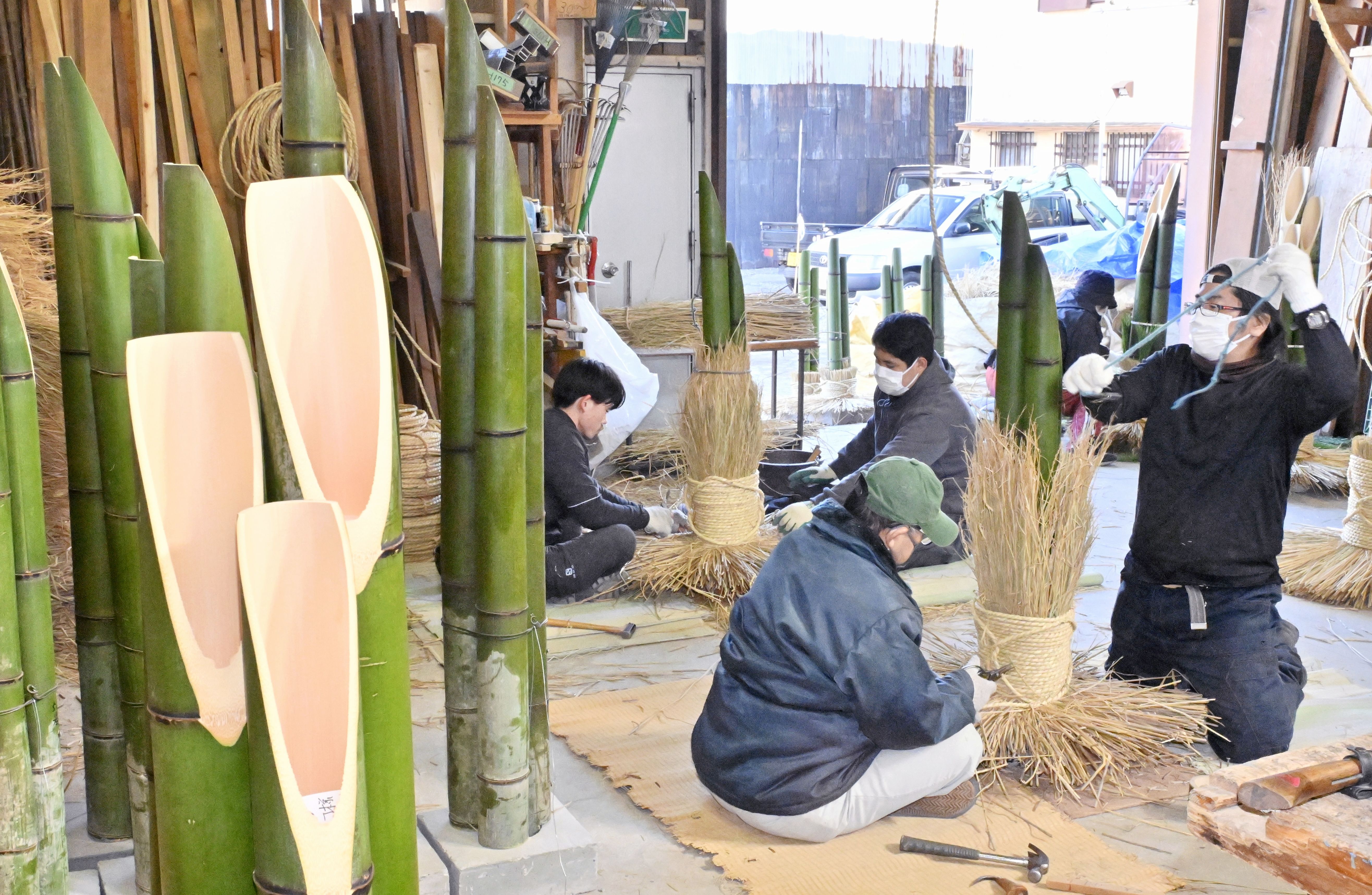 最盛期を迎えた門松作り=18日午後1時55分、宇都宮市泉町