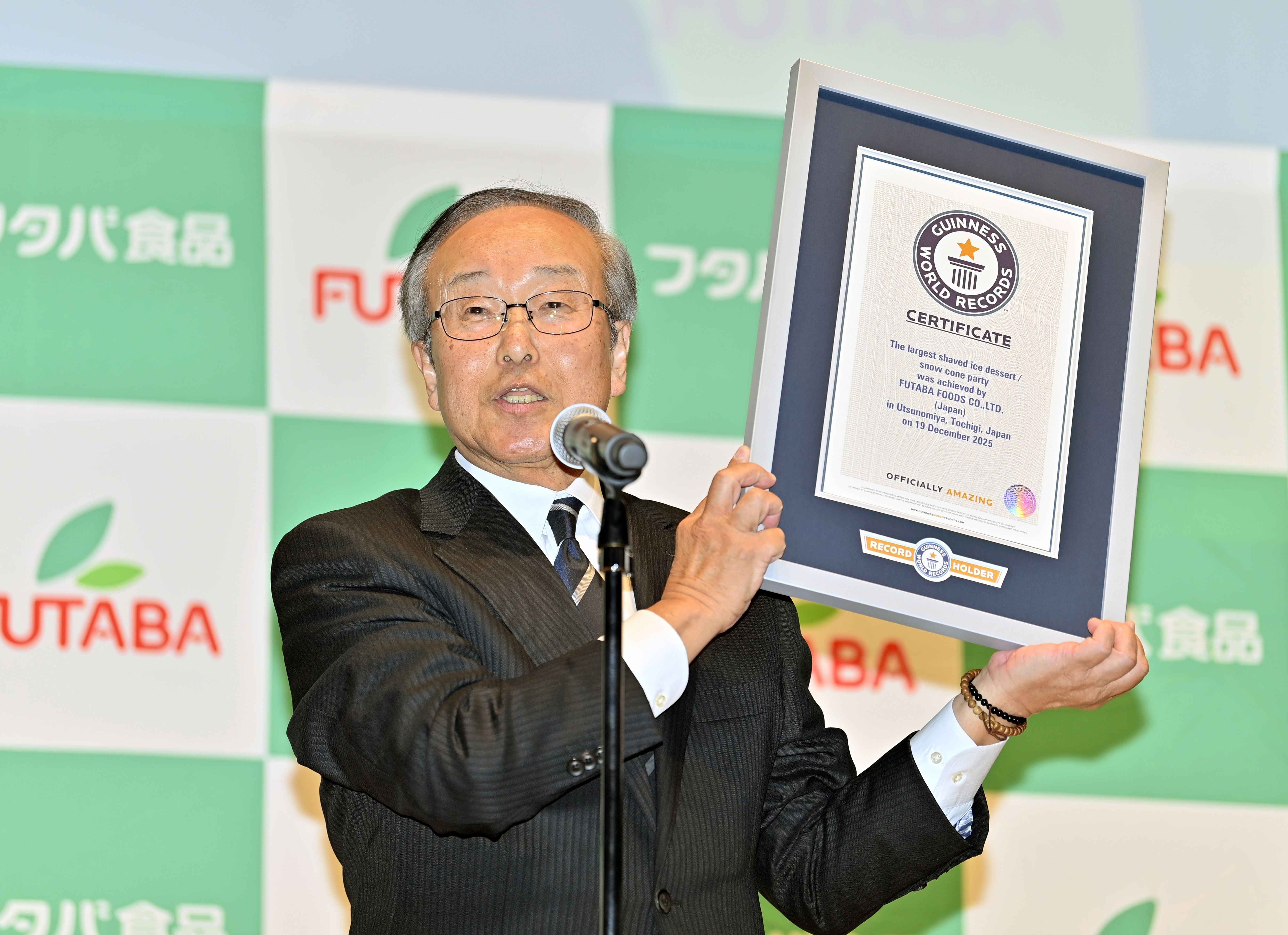 ギネス世界記録を目指し、一斉にサクレを食べる社員ら=19日午後2時10分、宇都宮市宮みらい