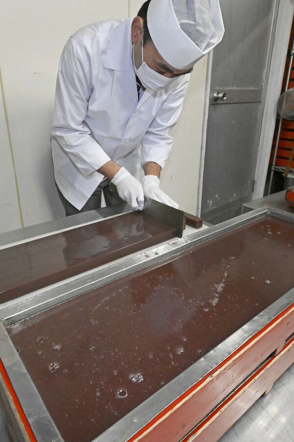 切り分けられる水ようかん=19日午後2時25分、日光市中鉢石町