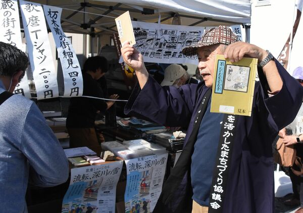「栃木の耕書堂」として黄表紙などを販売する歌麿交流館のメンバーら