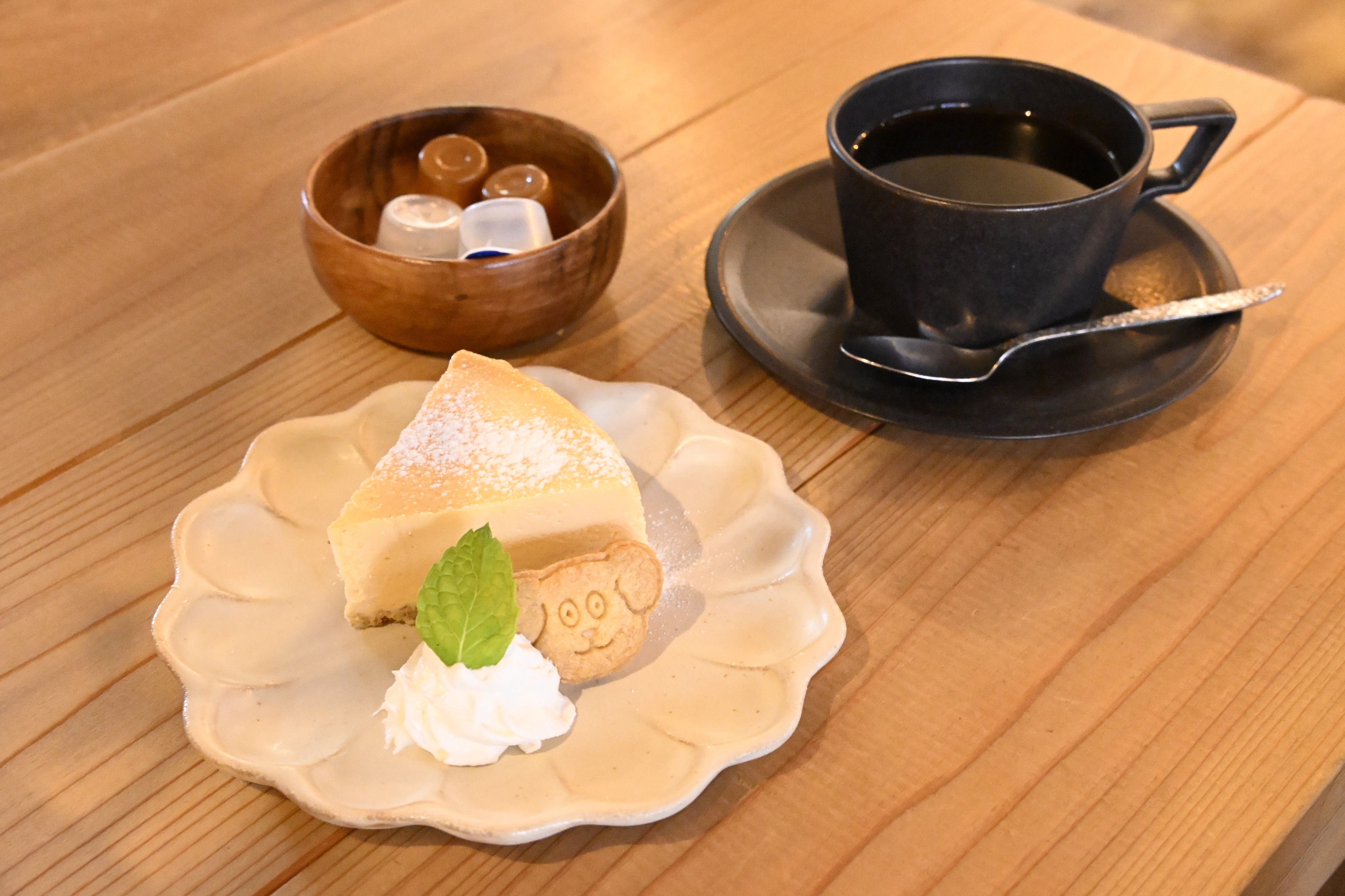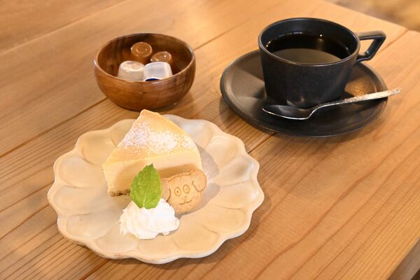 「自家焙煎珈琲 雪月花ブレンド」(右)とチーズケーキ