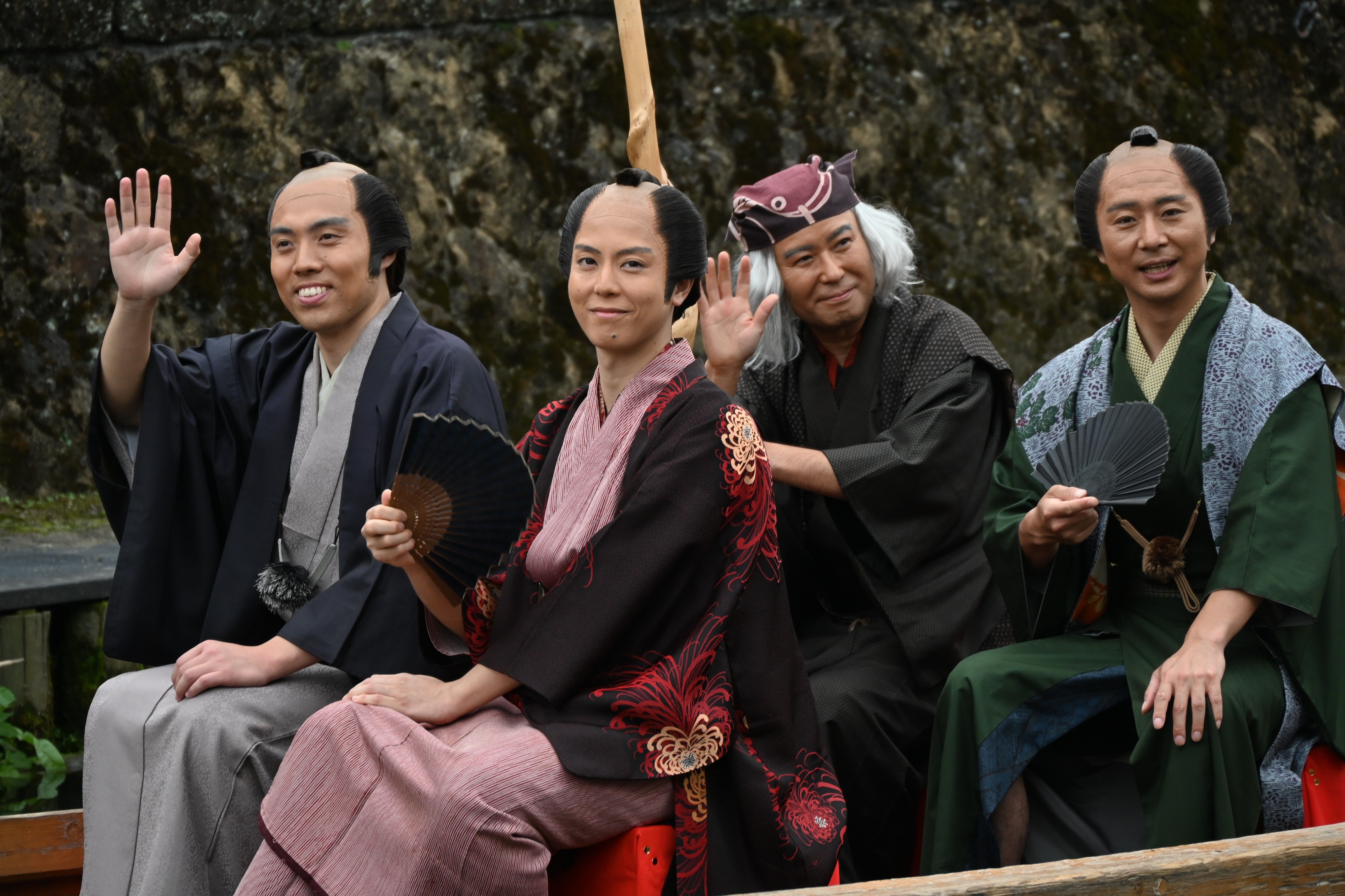 歌麿役を演じた荒井さん(左から2人目)と蔦重役を演じた戸田さん(同4人目)ら出演者
