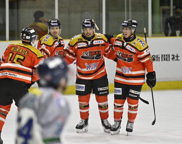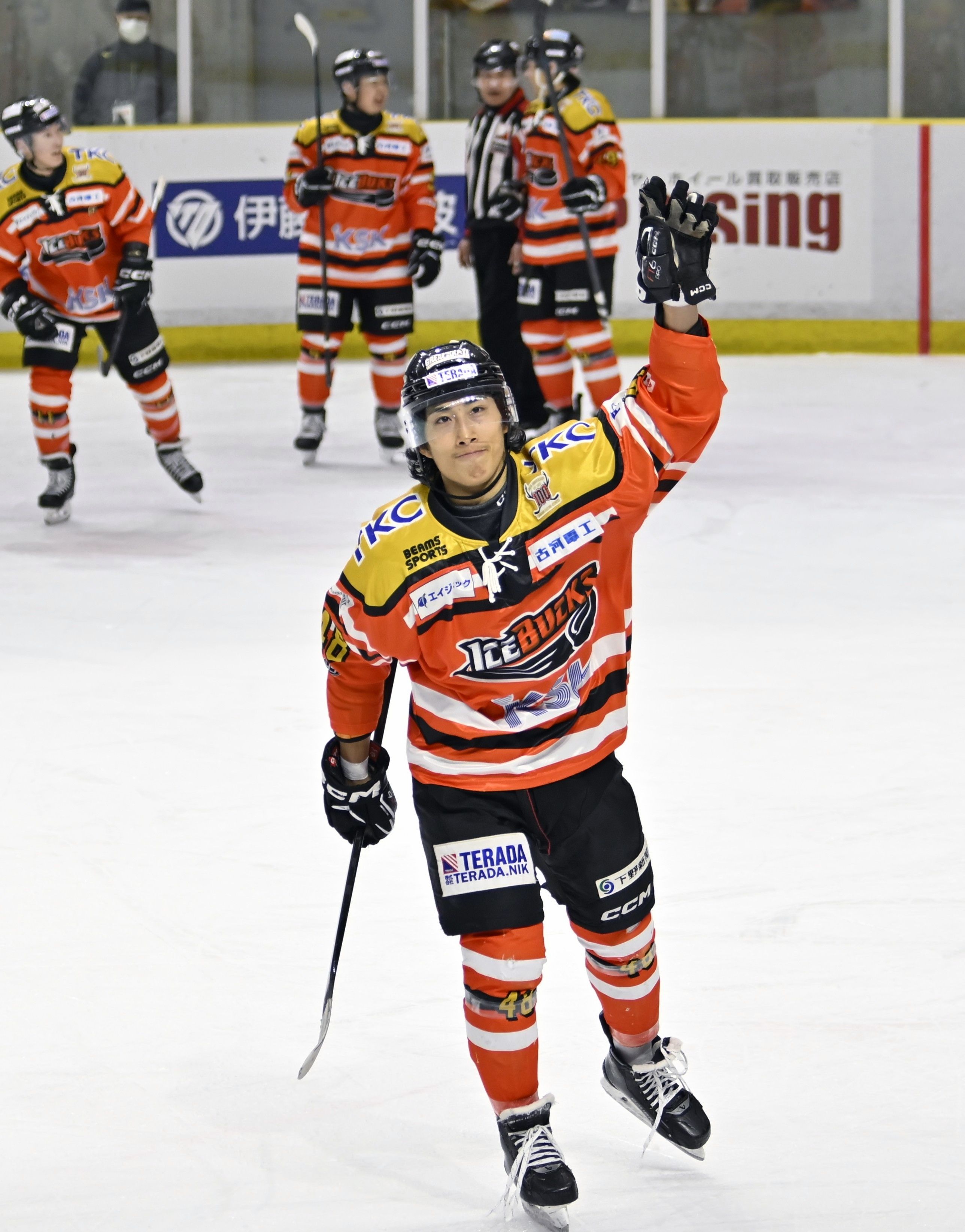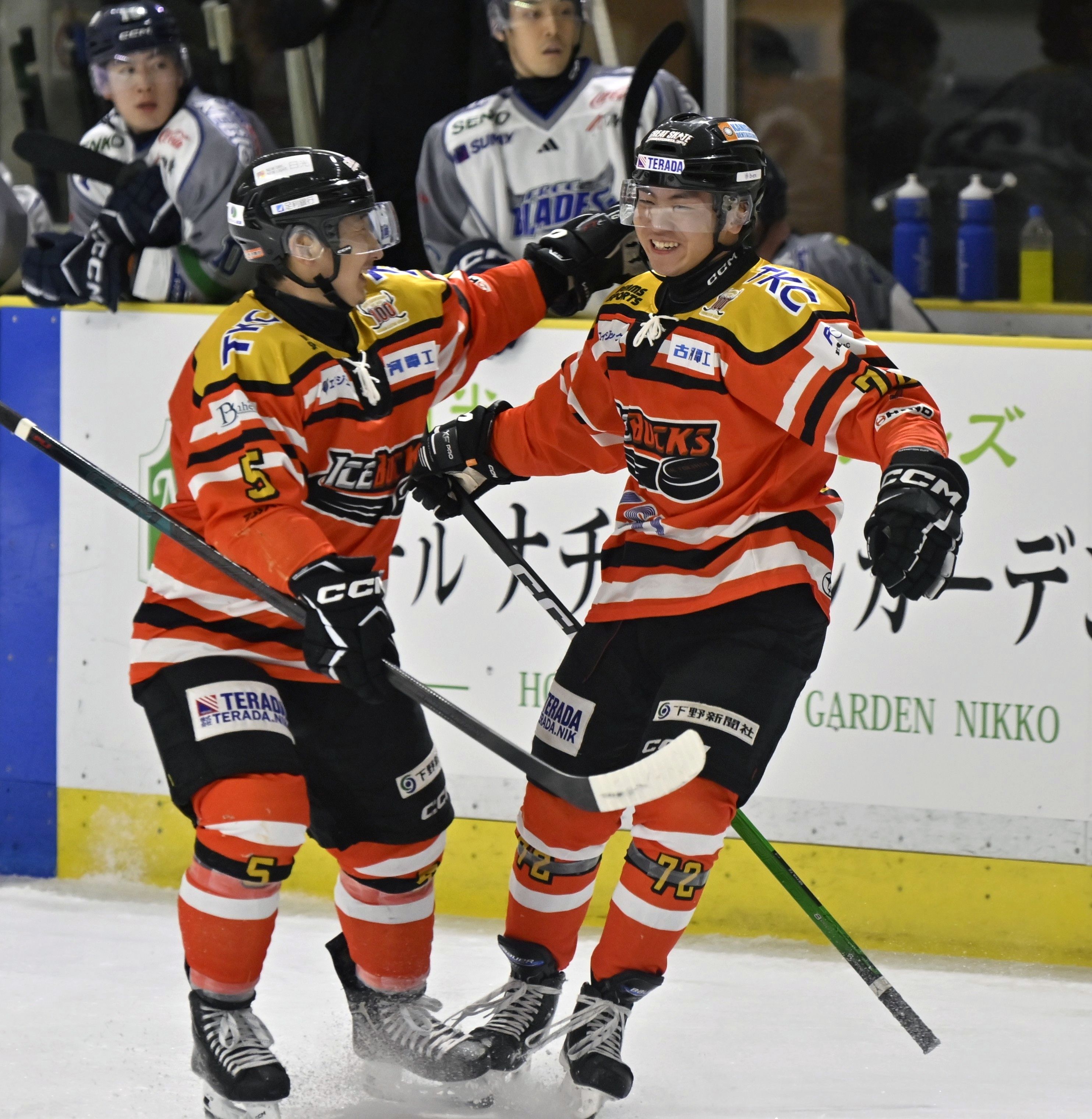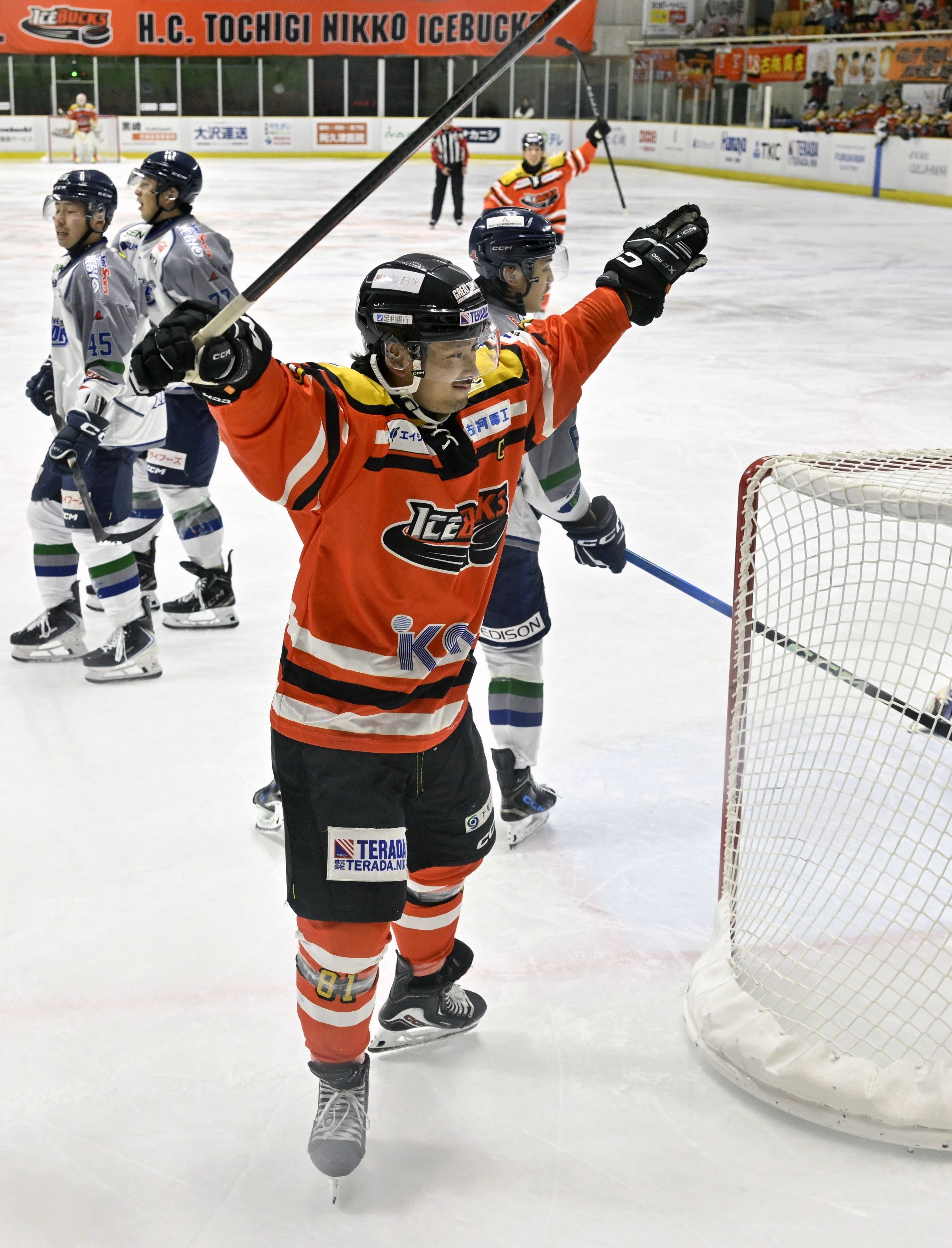 第1ピリオド15分32秒、バックスの寺尾(中央)が2点目を決めて喜ぶ=日光霧降アイスアリーナ