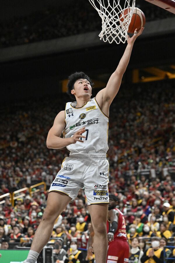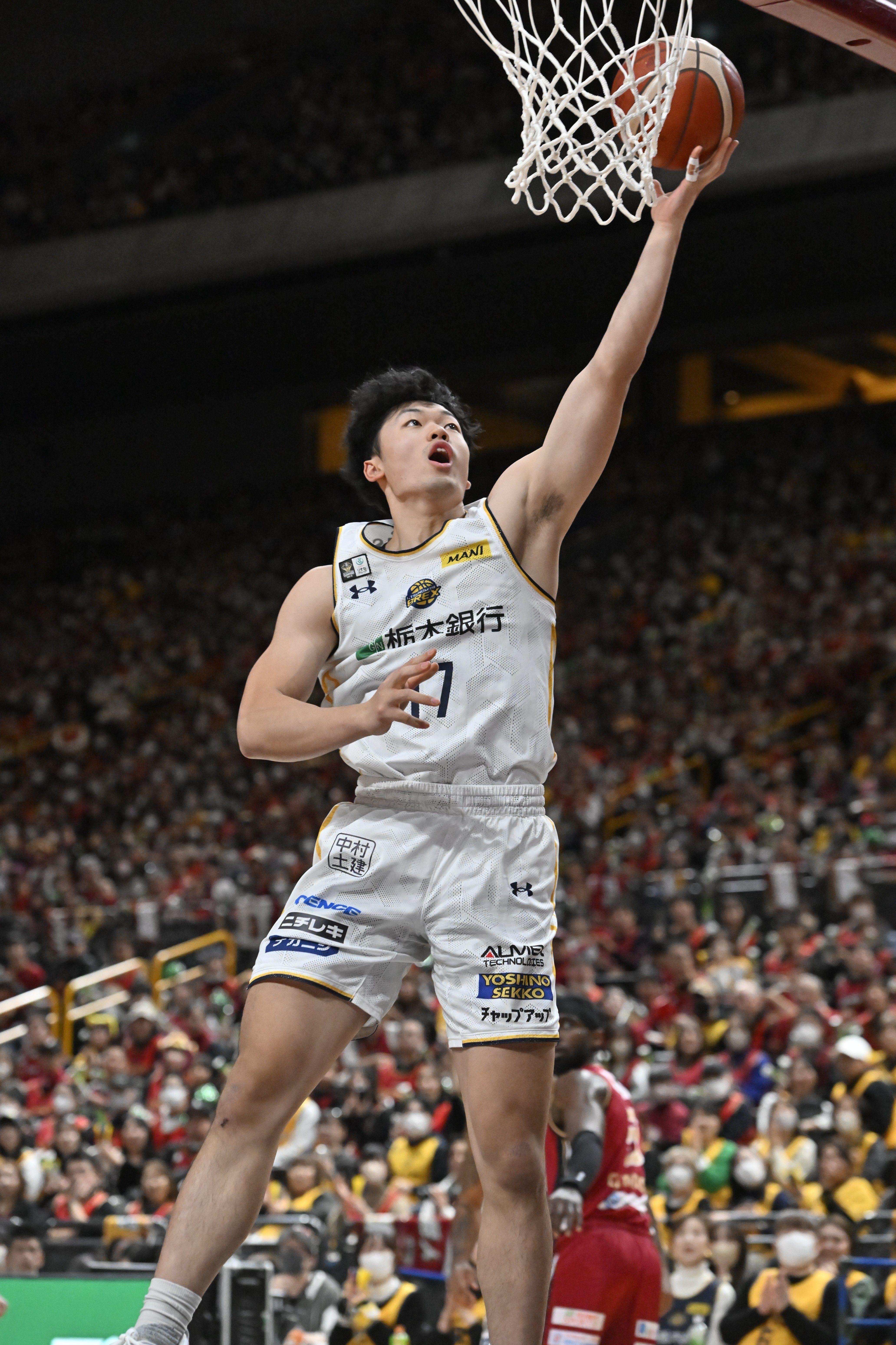 第1クオーター5分、ブレックスの星川が守備を振りほどきレイアップシュートを決める=さいたまスーパーアリーナ、加藤竜矢撮影