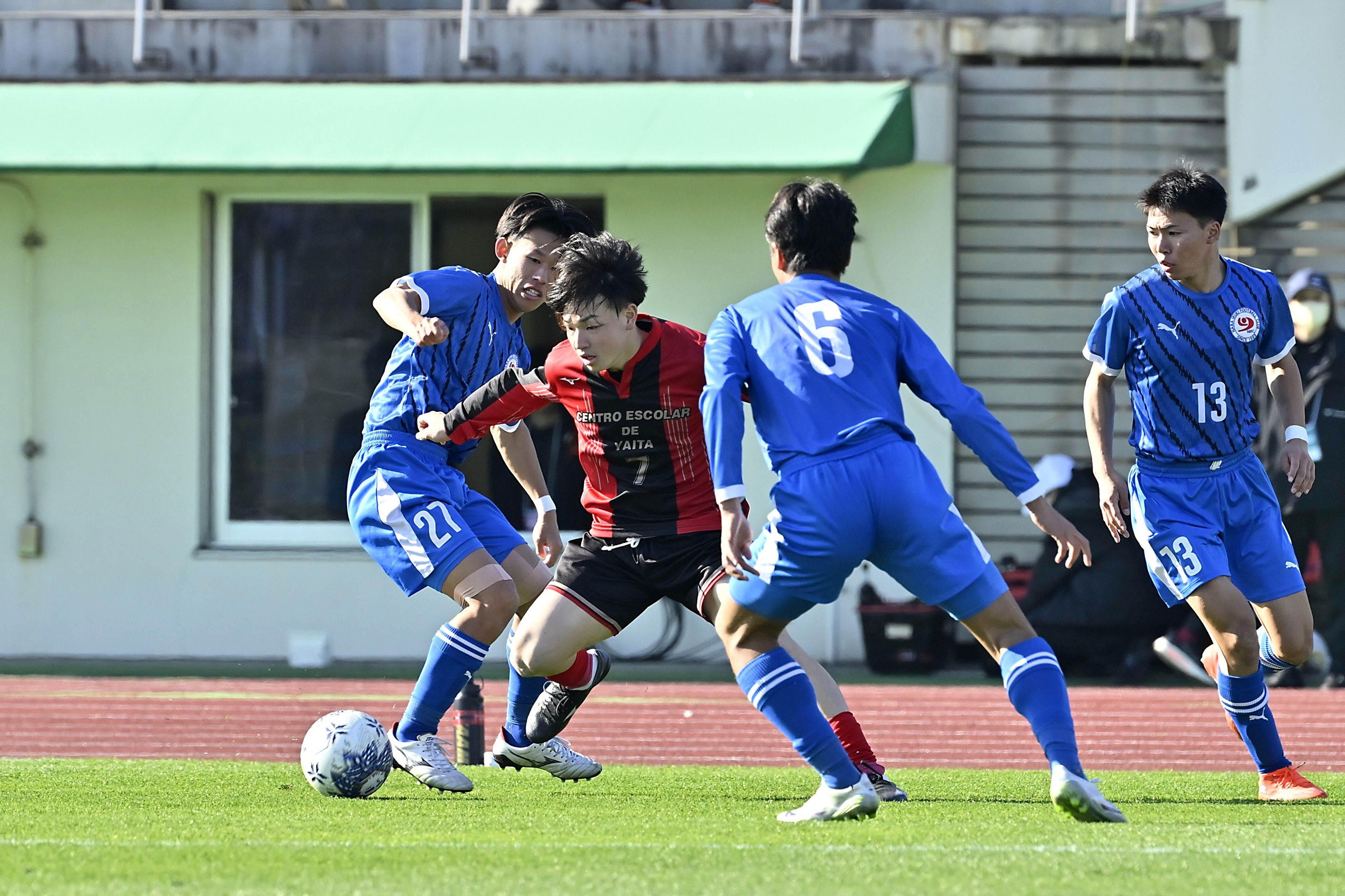 後半2分、矢板中央のMF平野(中央)が相手ディフェンスに囲まれながらもドリブルで切り込む=ゼットエーオリプリスタジアム、広瀬華撮影