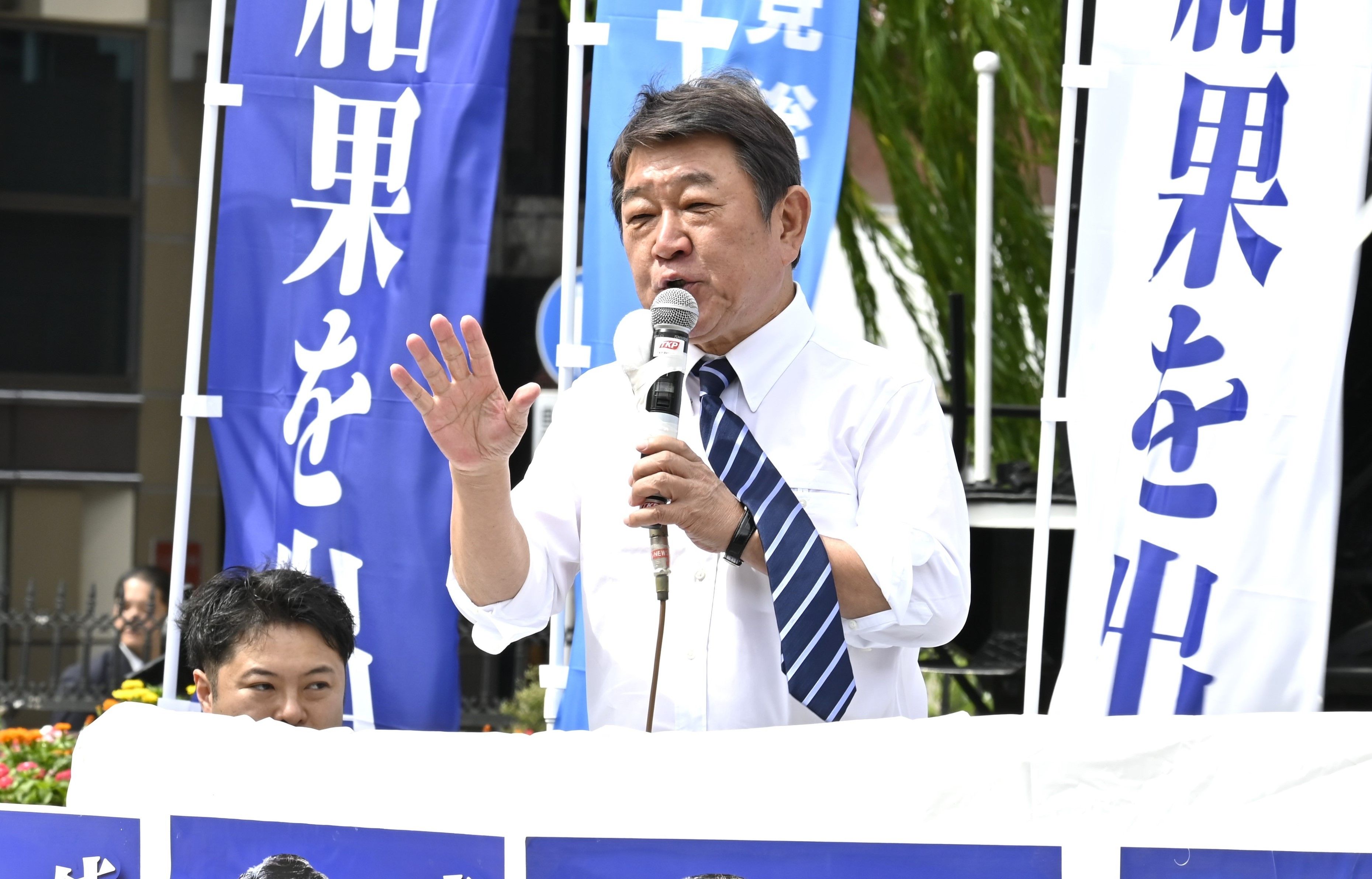 JR新橋駅前で第一声を放つ茂木氏=22日午前、東京都港区