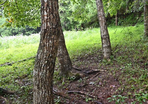 シカの死骸のあった草久の山林。ふもとには民家が点在する