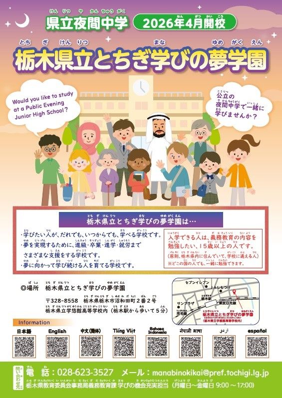 来春開校する県立夜間中学「とちぎ学びの夢学園」の生徒募集チラシ
