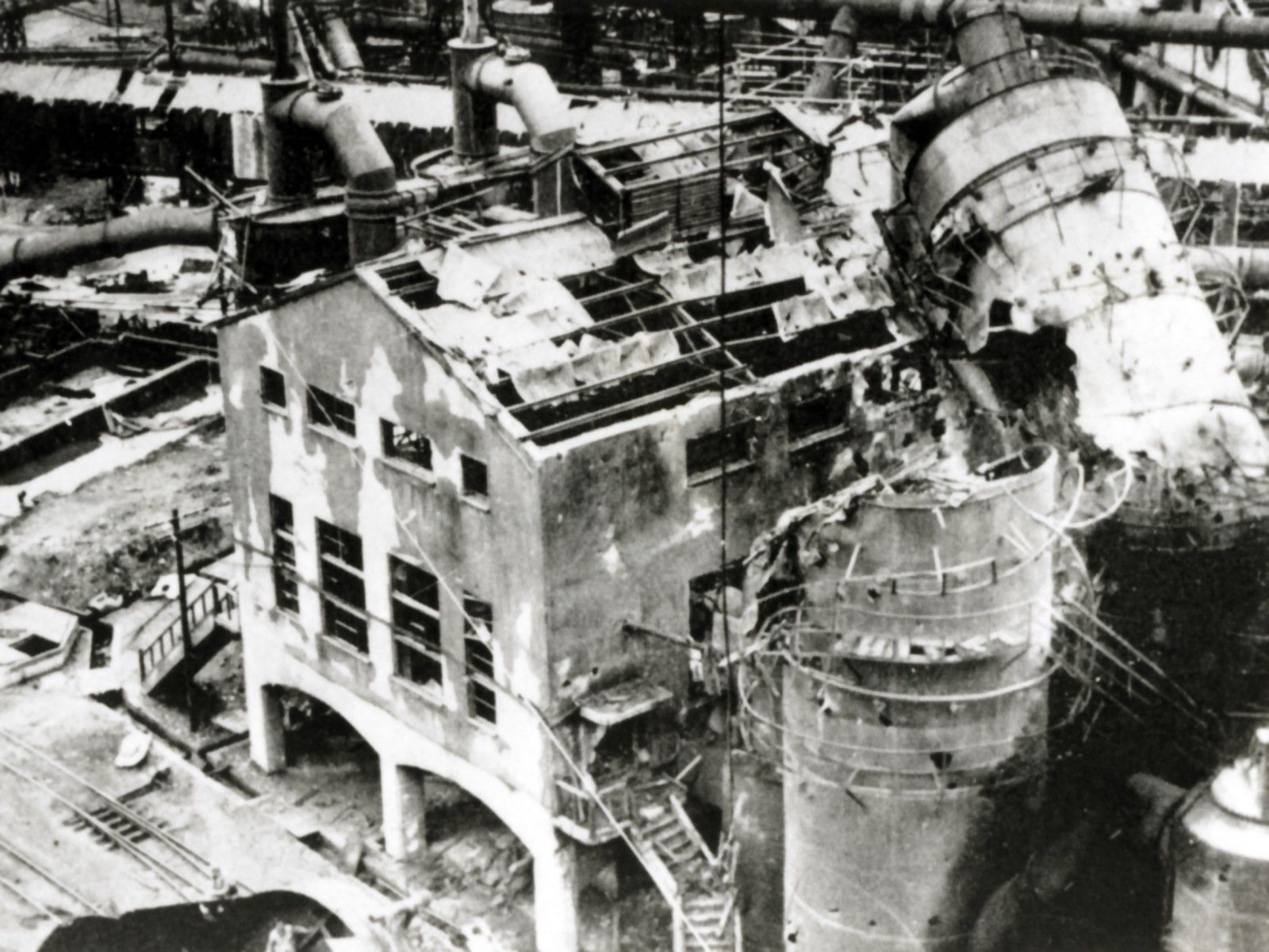 釜石艦砲射撃で甚大な被害を受けた製鉄所(市郷土資料館提供)